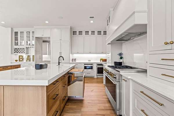 The chef's kitchen pairs beauty and function with dual islands, custom cabinet-front Thermador refrigerator and freezer, 48" GE Monogram range, built-in spice racks, and pull-out cutting board with chute over pull-out trash. A hidden prep pantry with uppers, lowers, open shelving, and under-cabinet lighting keeps the main kitchen pristine. The oversized utility includes an island with gift-wrap sized drawers, sink with window above, folding counters, and hanging racks--perfect for busy households.