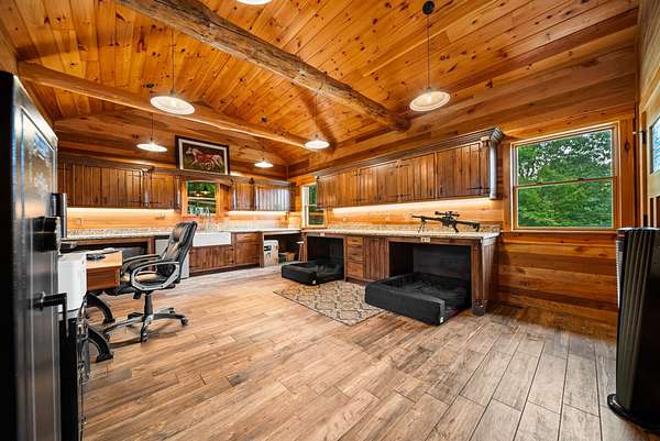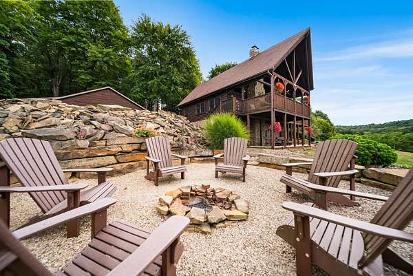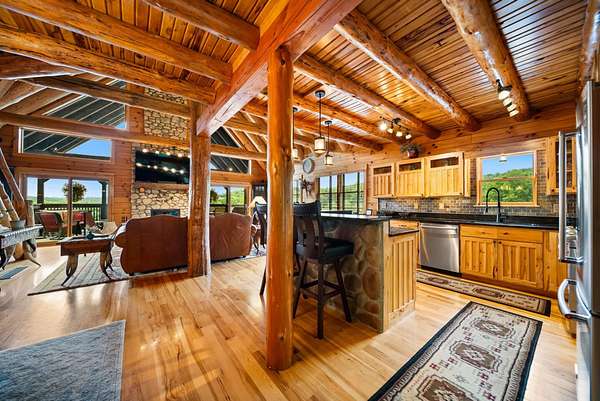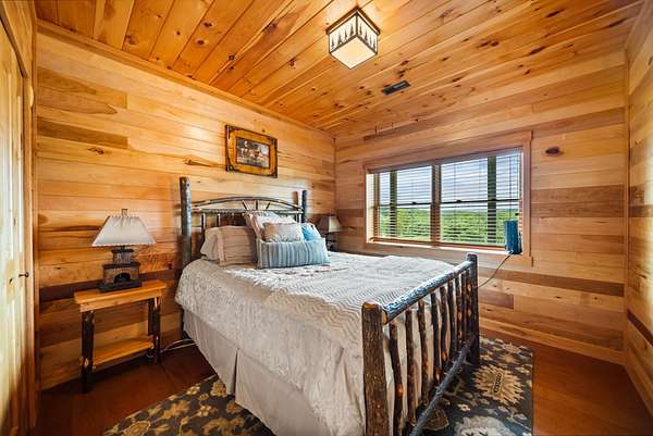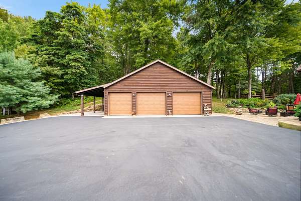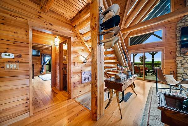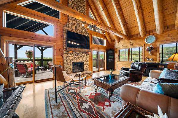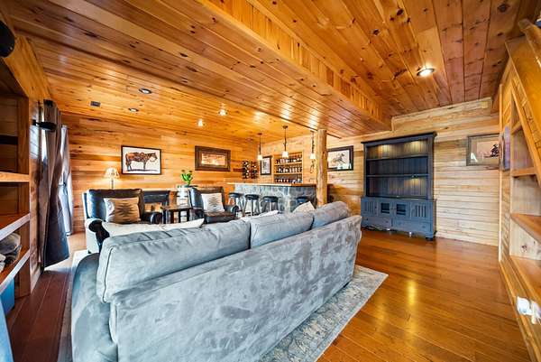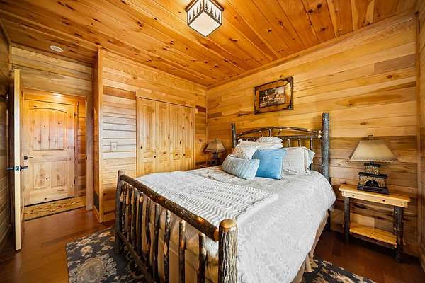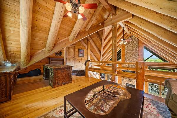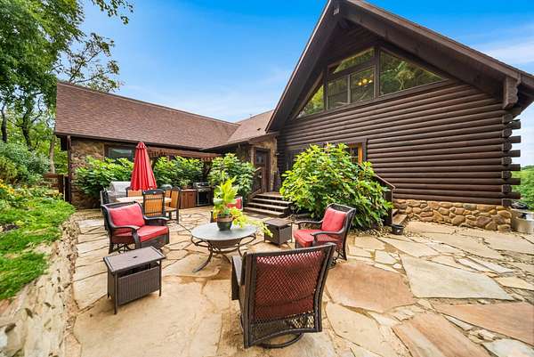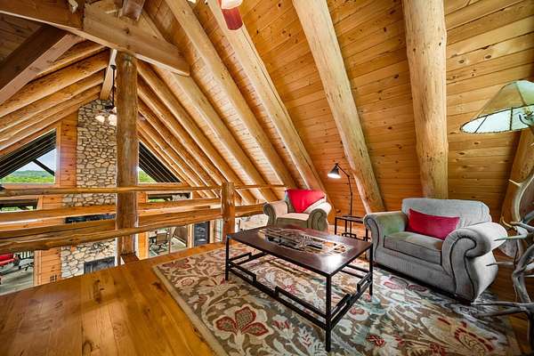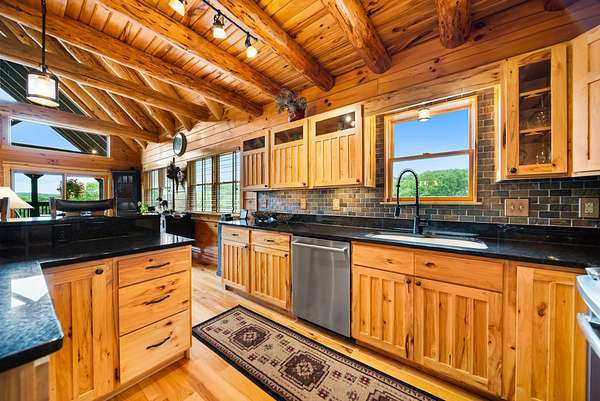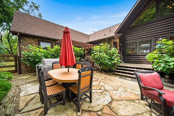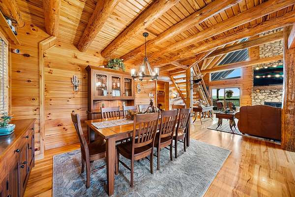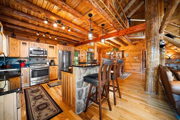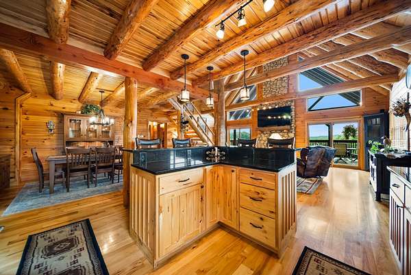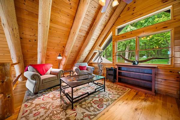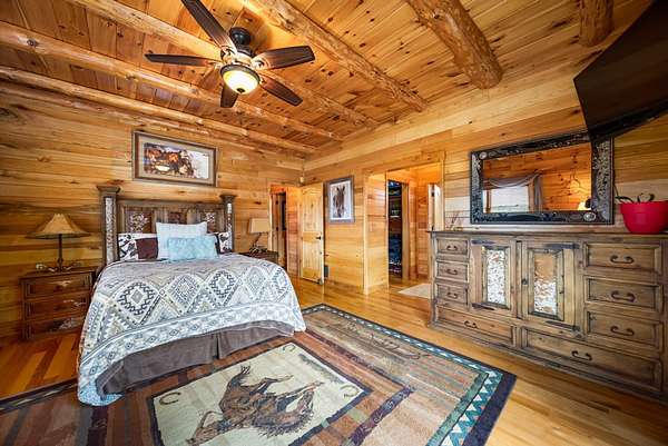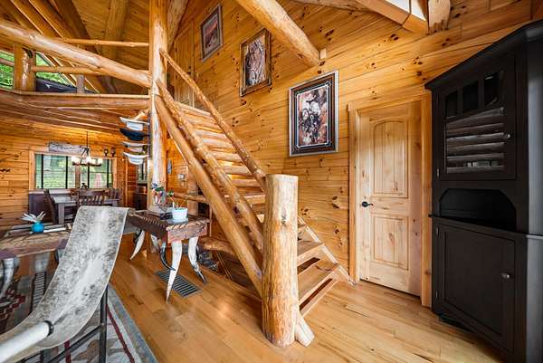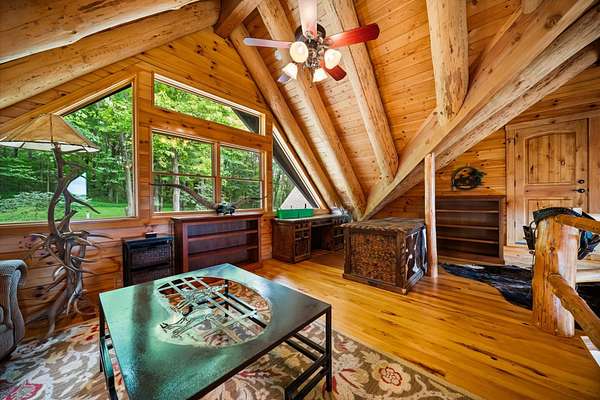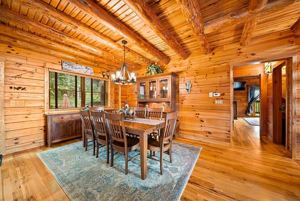 The home is a beautiful Jubach-built log cabin with just under 3,200 sq. ft. of finished living space, including a walkout basement. There's an additional 1,000+ sq. ft. of unfinished space as well. Inside you'll find 3 bedrooms (potential for 5), 2.5 bathrooms, and a huge flex room that could serve as an office, extra bedroom, or hobby space. Two gas-start, log-burning fireplaces add to the charm, and a backup generator gives you peace of mind. The owner's suite features his and her closets attached to a luxurious bathroom. The basement features two bedrooms, ample storage, and a great entertainment space.