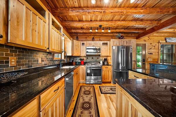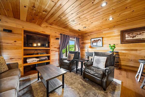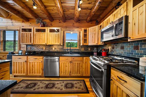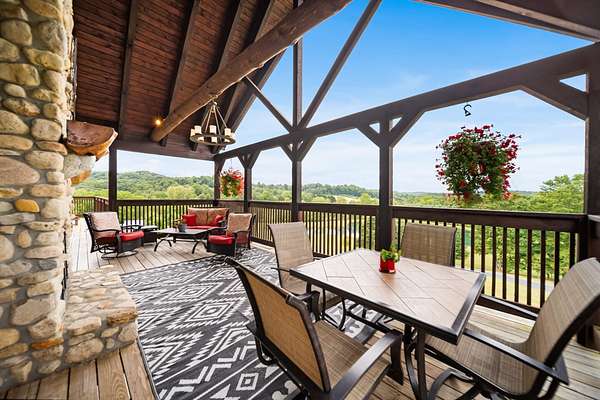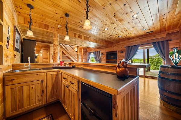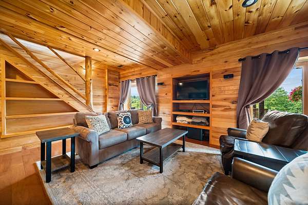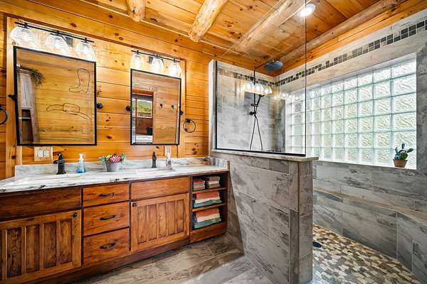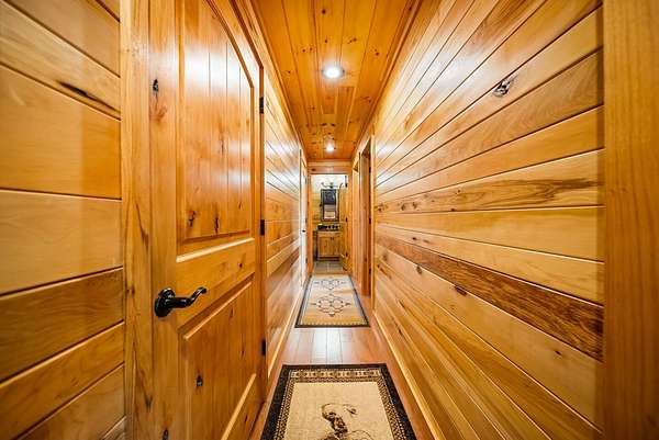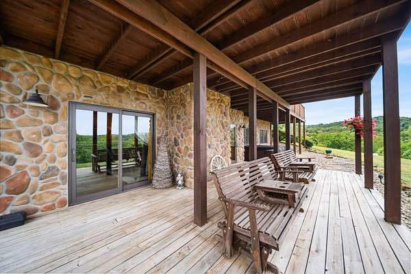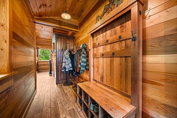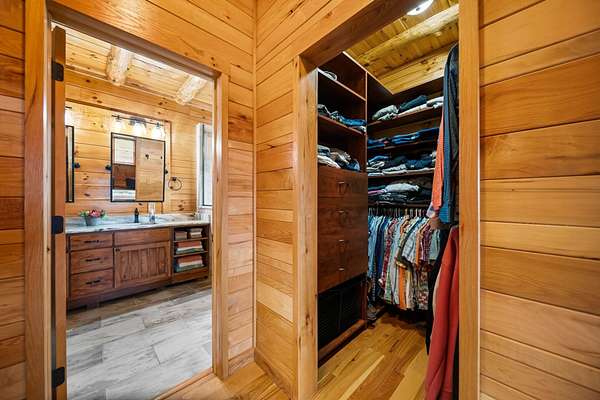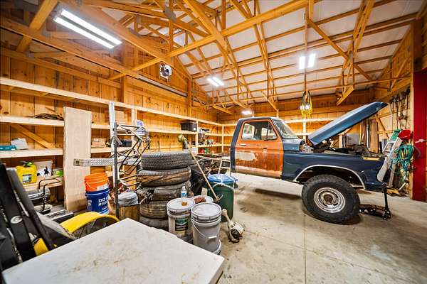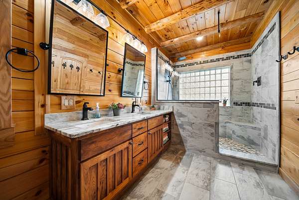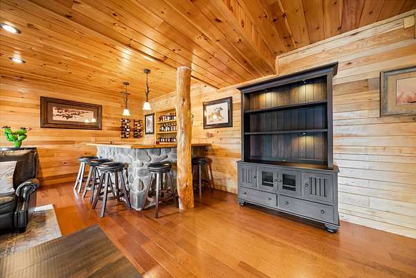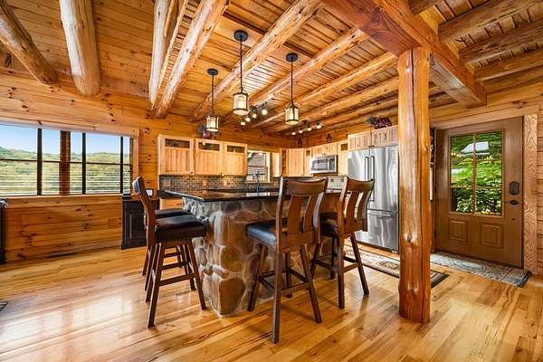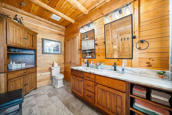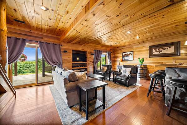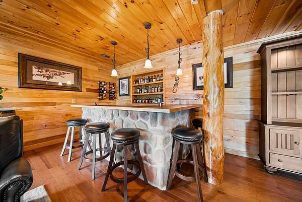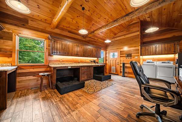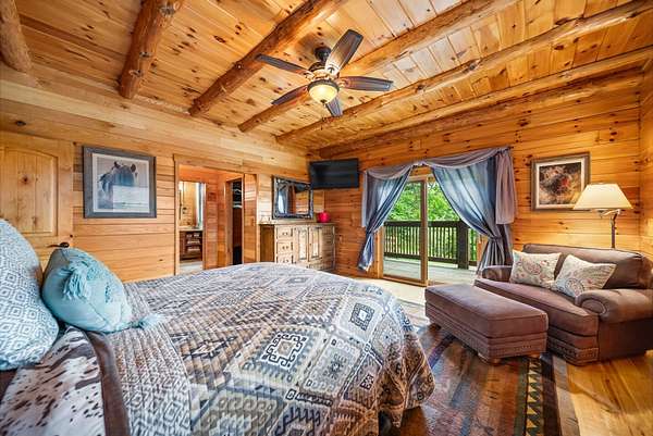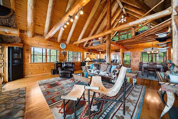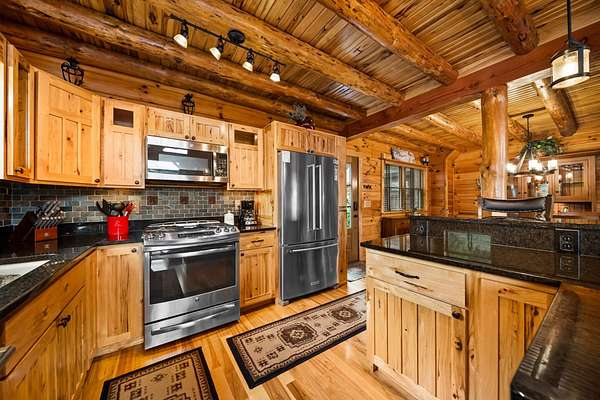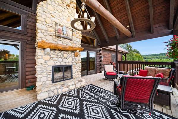 The home is a beautiful Jubach-built log cabin with just under 3,200 sq. ft. of finished living space, including a walkout basement. There's an additional 1,000+ sq. ft. of unfinished space as well. Inside you'll find 3 bedrooms (potential for 5), 2.5 bathrooms, and a huge flex room that could serve as an office, extra bedroom, or hobby space. Two gas-start, log-burning fireplaces add to the charm, and a backup generator gives you peace of mind. The owner's suite features his and her closets attached to a luxurious bathroom. The basement features two bedrooms, ample storage, and a great entertainment space.