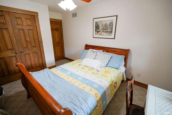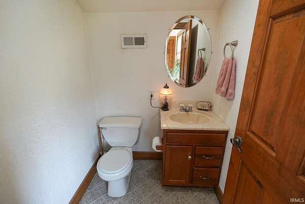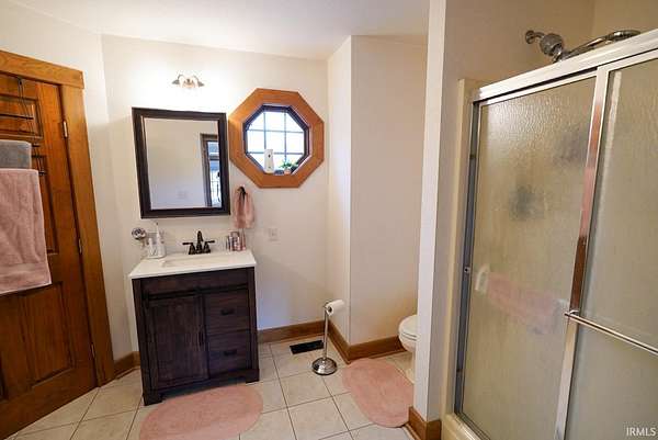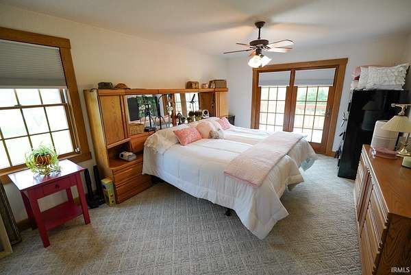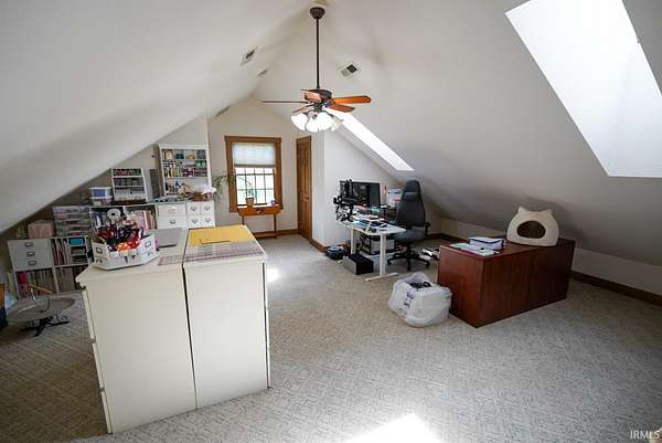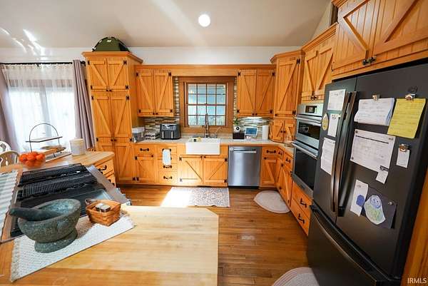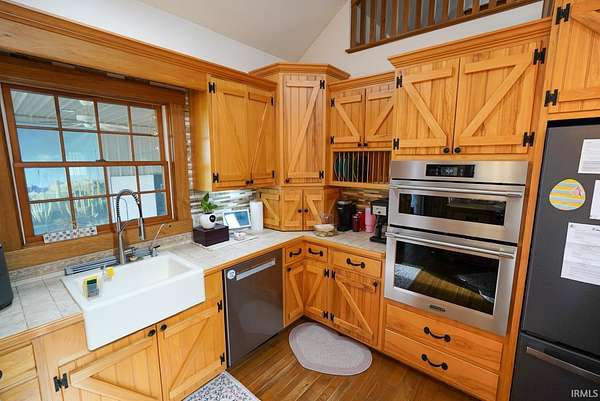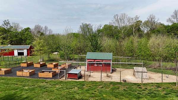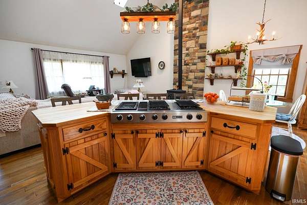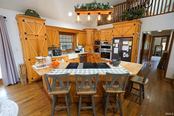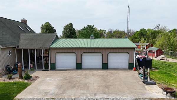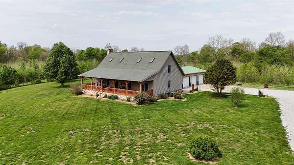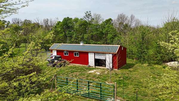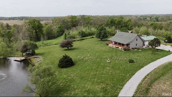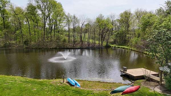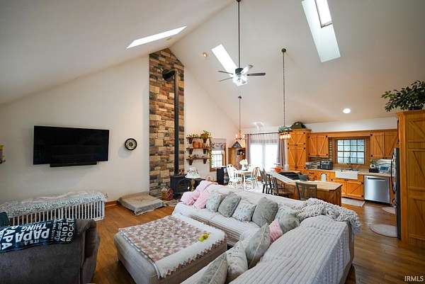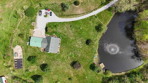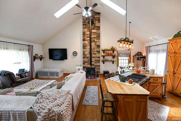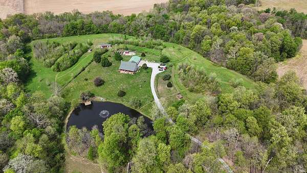 Escape to your own private retreat on nearly 40 acres of scenic countryside. This one-of-a-kind property is designed for those who appreciate nature, space, and versatility—featuring a custom-built home, a serene stocked pond with a sandy beach area, rolling pasture, mature fruit trees, and plenty of room for gardening or small livestock. Inside, the home welcomes you with an open and airy layout. The main level offers two generously sized bedrooms, two full bathrooms, and a dedicated laundry room with utility sink. The vaulted cathedral ceiling creates a dramatic focal point in the living, dining, and kitchen areas, complemented by a freestanding wood stove. The kitchen showcases custom hickory cabinetry, updated lighting, and modern appliances, while rich hickory hardwood flooring adds warmth and continuity throughout the main living space. The upper level features a spacious loft bedroom and a convenient half bath—ideal for guests or a private retreat. Downstairs, the mostly finished basement provides additional living space, including a theater room, two flexible bonus rooms, a large recreation area, and ample storage for hobbies or home canning. Step outside and explore your own backyard oasis with established trails for walking or riding, abundant wildlife and birdwatching opportunities, and endless potential for outdoor living.