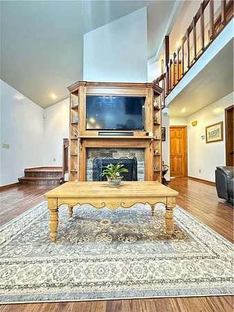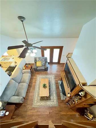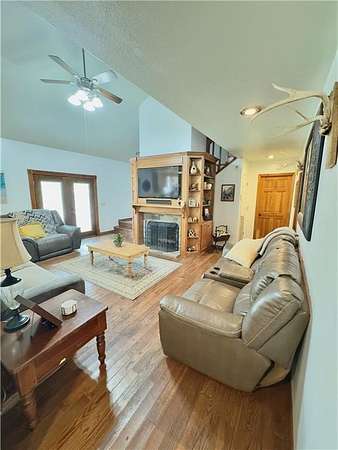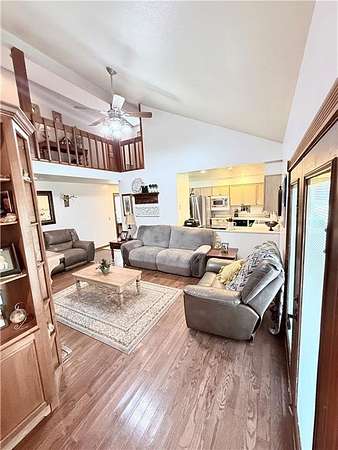 The living room features hardwood floors, tall ceilings, and a gas fireplace. The primary bathroom has been recently updated, and the home offers a functional layout with comfortable living areas throughout.