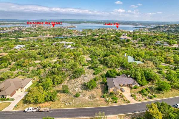 Build your dream home on this exceptional double lot in the heart of Horseshoe Bay. Spanning approximately 85' wide by 280' deep, this unique property offers the best of both worlds-an upper homesite on Mountain Dew Rd that is level and ready to build with utilities in place, and a lower portion along Long Branch that slopes away, helping preserve your long-range views. Enjoy a desirable northeast-facing orientation with beautiful Hill Country and Lake LBJ views, perfect for capturing sunrises and cooler afternoons. Water and sewer are available, making this an ideal site for a full-time residence or weekend retreat. Located just minutes from Horseshoe Bay Resort (membership required), you'll have easy access to world-class golf, spa, pools, dining, and lakefront amenities. Conveniently positioned about an hour from Austin and 1.5 hours from San Antonio, this property offers both accessibility and a peaceful escape. With low Llano County taxes at just 1.33% and annual HOA dues of only $360, this is a rare opportunity to secure a premium homesite with lasting value and protected views.