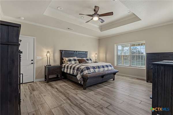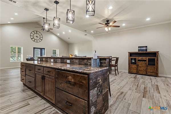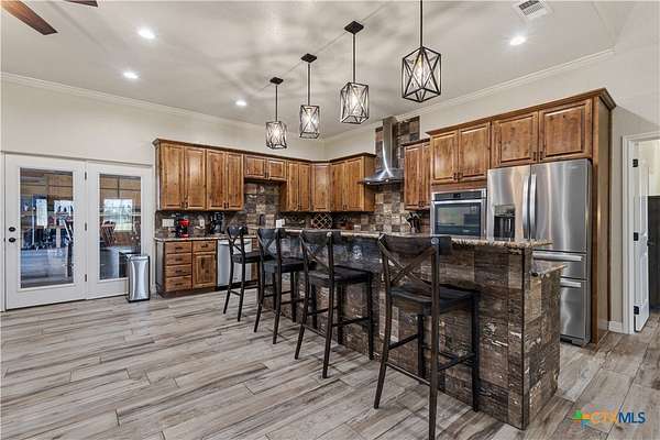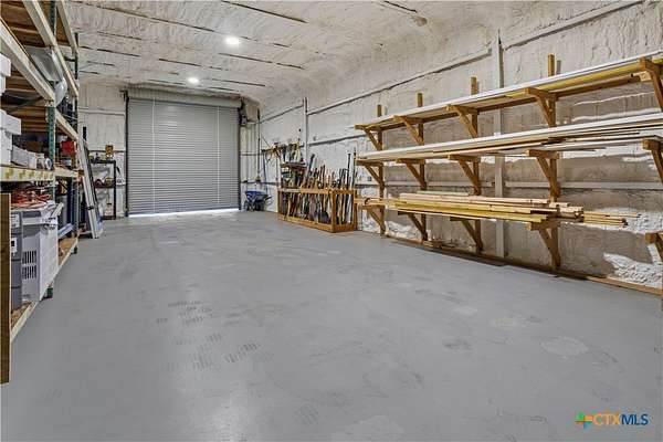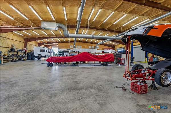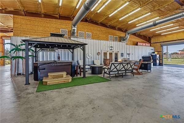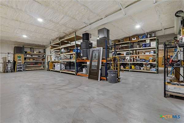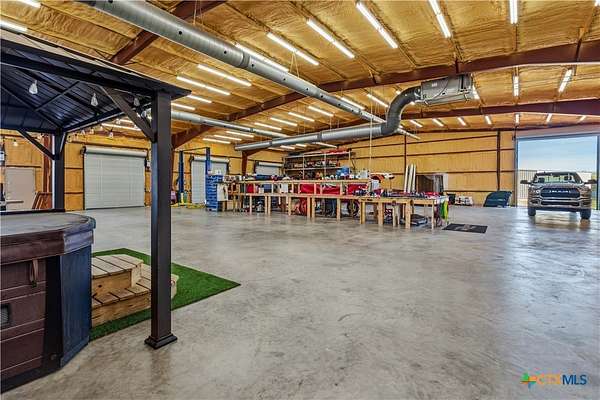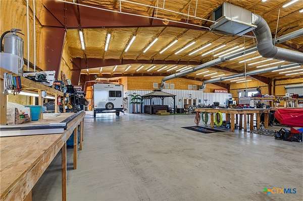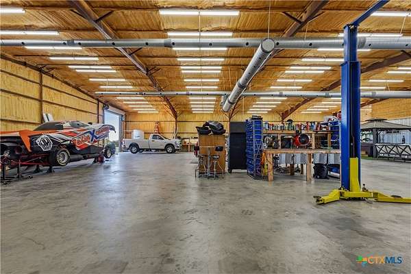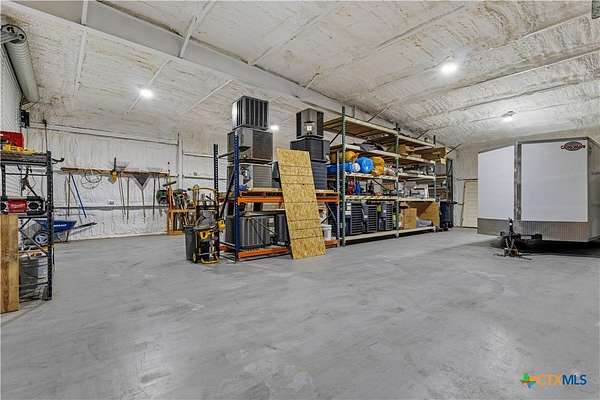 Unique Barndominium with Exceptional Garage Space & Flexibility This one-of-a-kind property features approximately 2,300 sq ft of living space with an open floor plan, tile flooring throughout, and spray foam insulation in walls and ceilings for energy efficiency. The kitchen offers granite countertops, stainless steel appliances, built-in double oven, and cooktop. The primary suite includes a garden tub, spacious shower, and double vanity with copper sinks. Guest bath also features double vanity with copper sinks. Utility room with granite counters, cabinetry, and folding space. The 7,200 sq ft climate-controlled main garage includes 15 tons of AC, multiple automatic doors, 12,000 lb car lift, 220V plugs (RV, welder, compressor), shelving with power, bay lighting, 30,000 kW generator, and 750-gallon water tank. Enjoy outdoor living with a spacious porch, 6-person hot tub, and multiple outdoor showers. A 5,000 sq ft secondary garage offers an 840 sq ft flex room with full bath and HVAC, plus multiple automatic doors and outdoor shower. Additional 2,400 sq ft detached garage with large doors, lighting, and outlet. Property includes concrete drive to all garages, aerobic septic system, 610' well (Lower Trinity), mixed fencing, water softener, and exterior lighting. Perfect for hobbyists, family fun, or those needing additional space.
