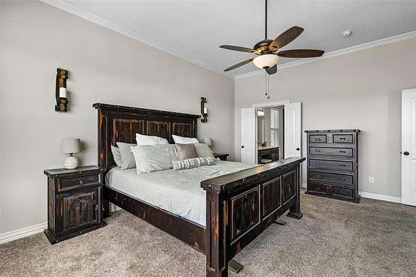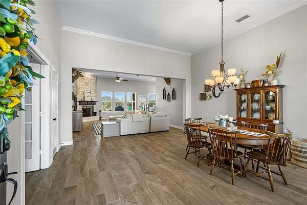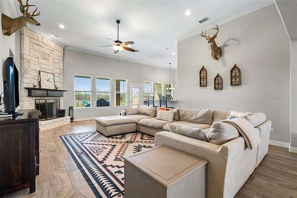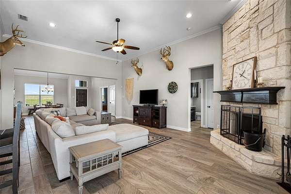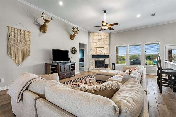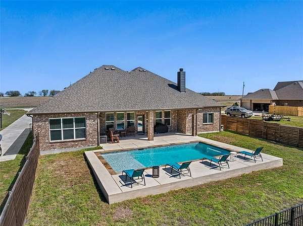This Beautiful 4-bedroom, 2 bath home, sits on 2.54 acres, is offering an open floor plan as you enter, with wood-look tile flooring throughout. The stone fireplace in the living room adds to the beauty of high ceilings with crown molding. The windows across the back of the home let in natural lighting and a scenic view of the pool. The kitchen includes a large pantry, and large island. The slit bedroom arrangement give privacy to the Primary Suite. The expansive covered patio and heated, fenced pool is ideal for outdoor entertaining & enjoyment. A 3-car garage completes this stylish and functional home- all on 1 level. Oh yes, it has an office as you come in through the garage! The backyard backs up to a creek with trees. All the privacy and county-home living without an HOA and no city taxes! This is out of the city feel, but close enough to town to shop!