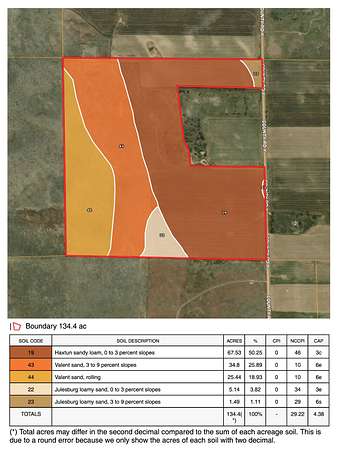 134.4 Ac. PASTURE AND DRYLAND FARM GROUND IN YUMA CO., COLO. Looking for an opportunity to purchase investment land or to add reasonably priced pasture and dryland to your operation. This tract offers: 76.89 acres of pasture with 71.88 of those acres also in grassland CRP with a $20/ac. annual payment and the contract expiring 9/30/31; and 52.51 acres of dry cropland with mostly Haxtun sandy loam soil. Buyer shall receive possession at closing. There are 24.31 acres of wheat base with a 43 bu. PLC yield; 9.41 acres of corn base with a 118 bu. PLC yield. The property is located southwest of Wray, Colo.; from Vernon go 4 mi. west on Co. Rd. 26, then 4.75 mi. south on Co. Rd. Y. The legal description is NE/4 (less a tract) of Section 22, 2S-45W. No mineral interests are available with this property. The 2025 property taxes are $135.85. CALL THE LISTING COMPANY TODAY FOR MORE INFORMATION.