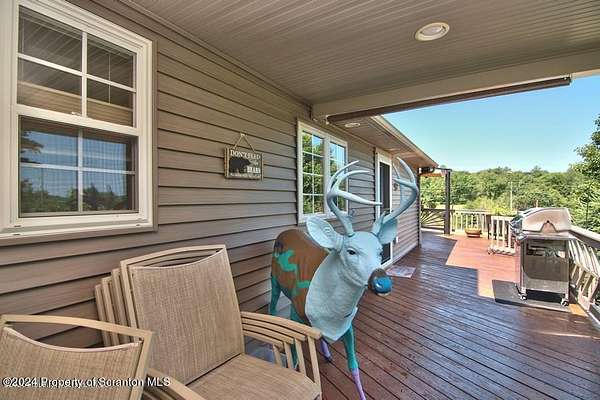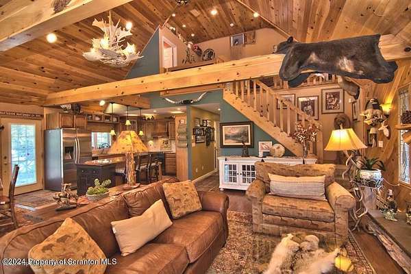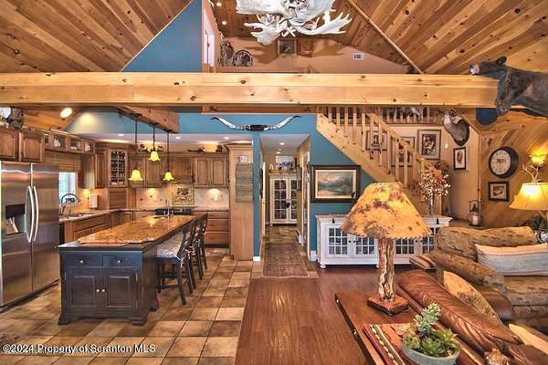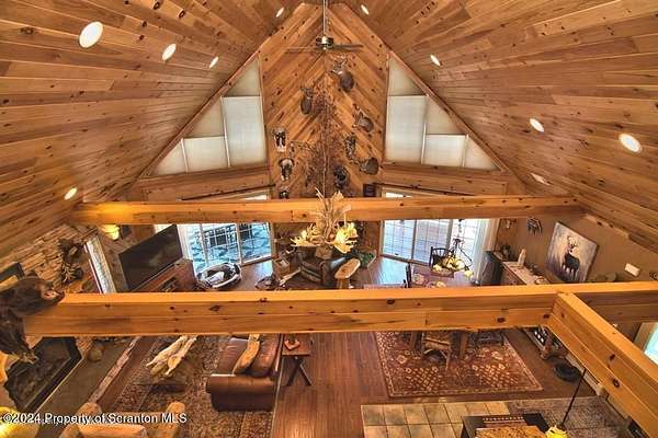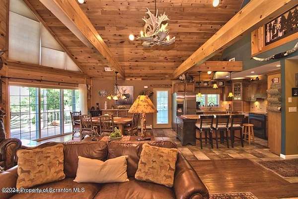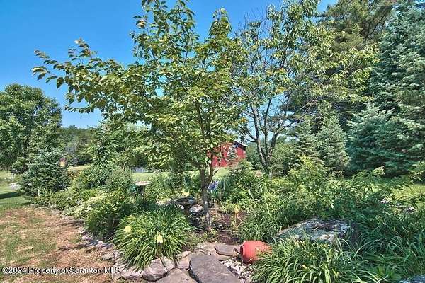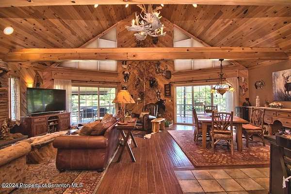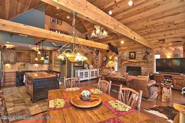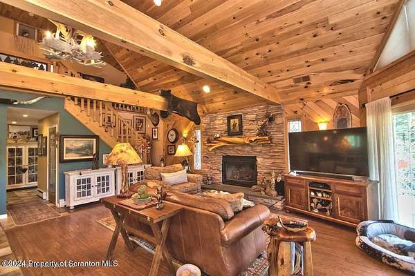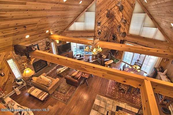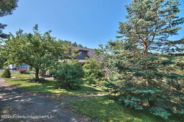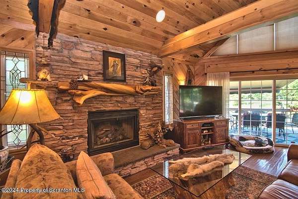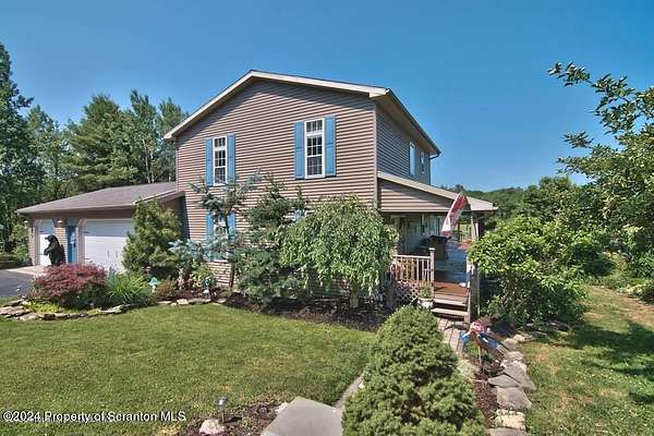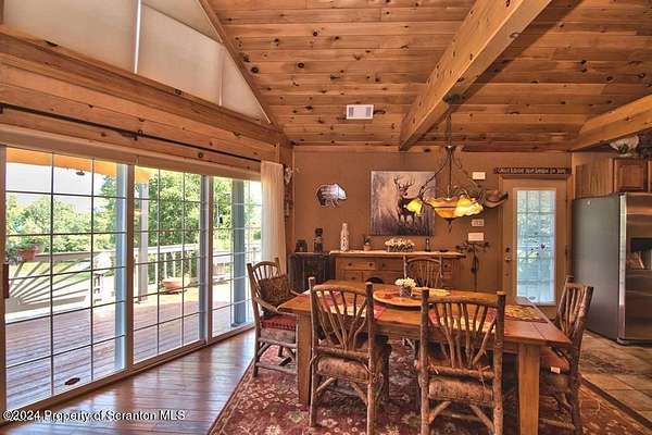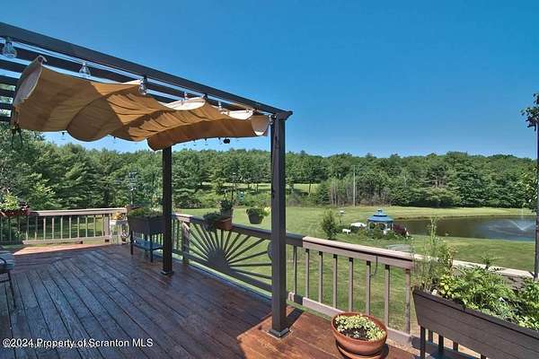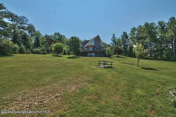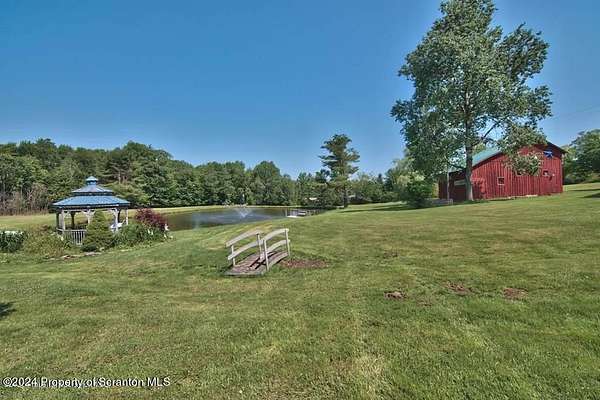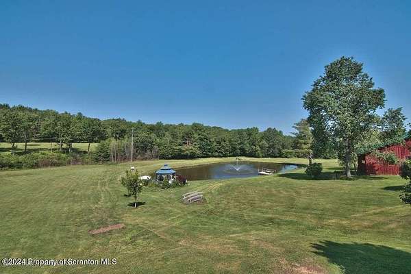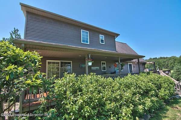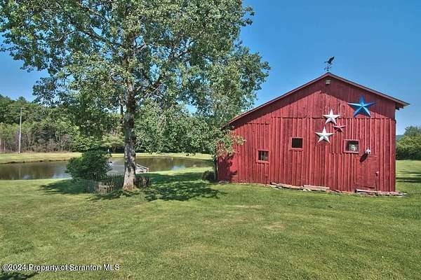 Special accents from all over the world, welcome you to this custom built Contemporary on 45+ country acres. This nature lovers paradise is surrounded by the pristine NEPA mountains. Natural twisted juniper mantle, light fixtures from Italy, gorgeous sink from Mexico, and many more tributes to travel memories. The heart of every home is the kitchen. This gourmet kitchen boasts granite counters, hickory cabinets, touch faucet, and stainless appliances. Easy flow into from the Great room and Dining room. Enjoy gorgeous views of all 4 seasons through soaring floor to ceiling windows while relaxing in front of your stone gas fireplace. This focal point features Hand hewn ceiling beams, cathedral ceilings, tongue and groove and plenty of natural light. Glass doors open to your spectacular deck with covered pergola where you can enjoy entertaining. Master bedroom ensuite bath w/glass doors leading to deck, light up stone sink and Jacuzzi tub. Other exceptional features include central AC, laser cut metal screen, Stained glass door panels and shutters, ceramic tile baths and central vac. Finished lower level makes the perfect space for entertaining, complete with wetbar, 3/4 bath, 3 potential bedrooms. Can be used as guest or in-law suite. Sliders lead to your perfect tranquil setting. Stone patio, rear yard, beautifully landscaped, plenty of wildlife. Koi pond is full of many different beautiful types and is a wonderful swimming pond. Dock, gazebo with electric & fountain are a perfect peaceful setting to relax. Pride in ownership is evident throughout the entire property. 4 car garage with drive-thru bay, outbuildings and barn offer plenty of storage. Immaculate and turn key ready. Over 3500 sq ft of living space, perfect for lots of family, friends & guests. Welcome home to your very own personal retreat. Close to Elk Mountain. All equipment is negotiable.