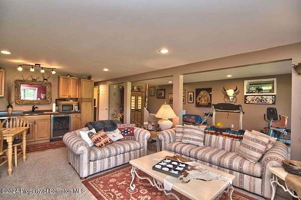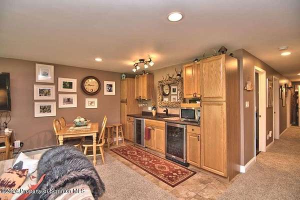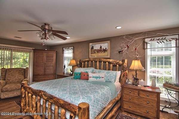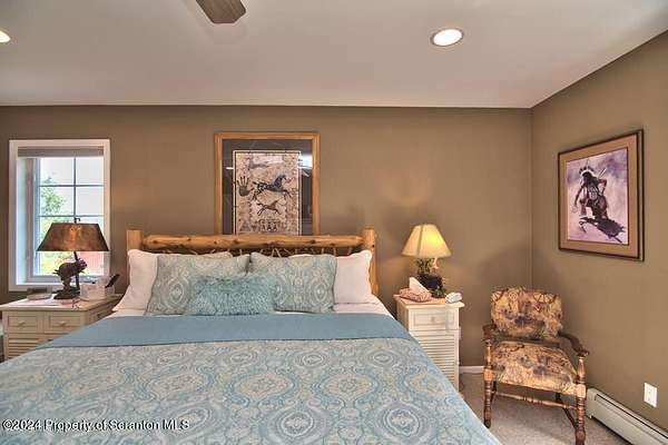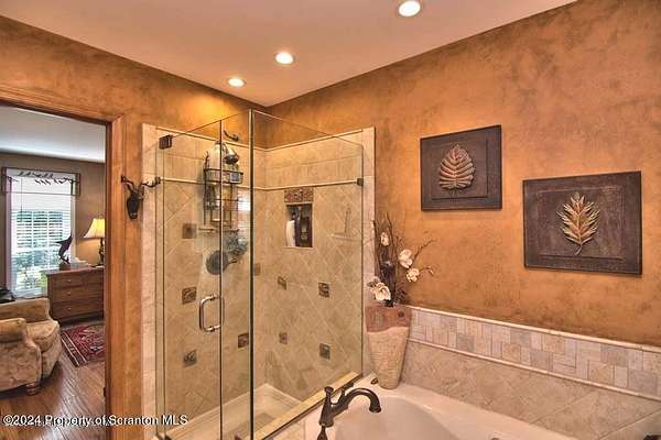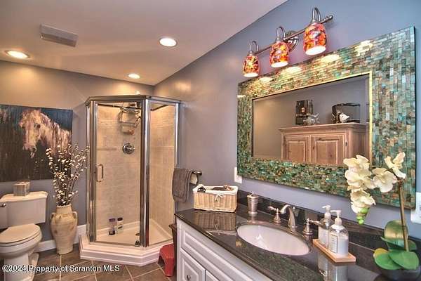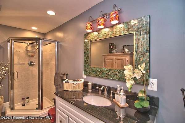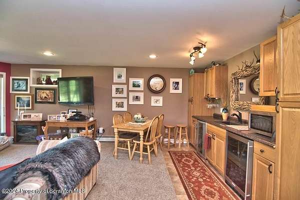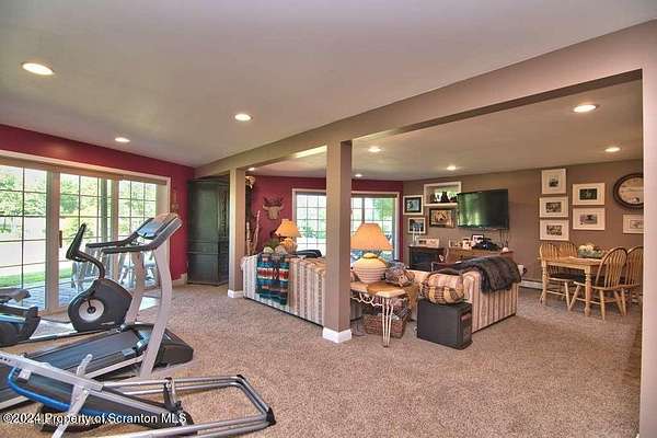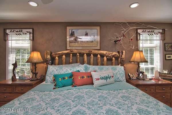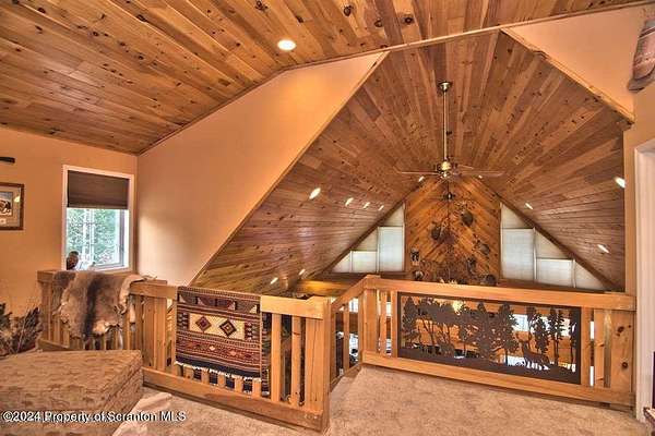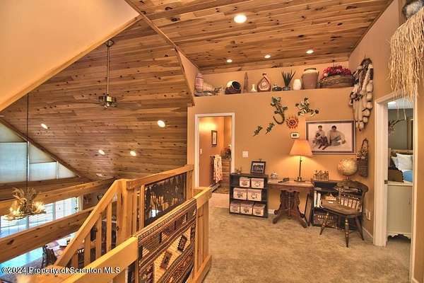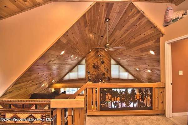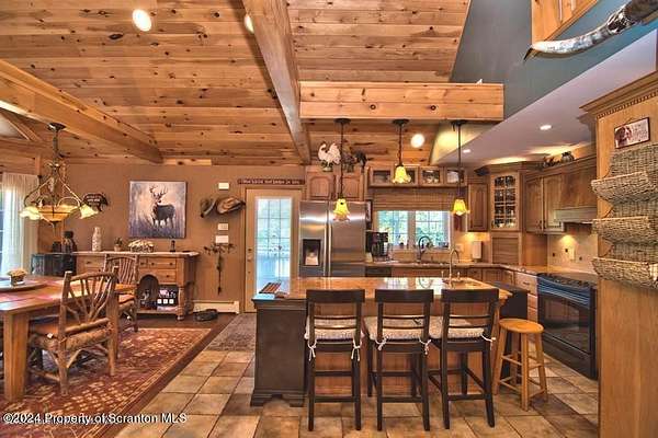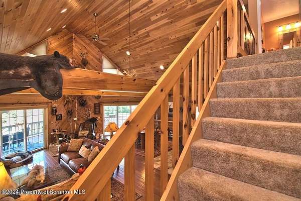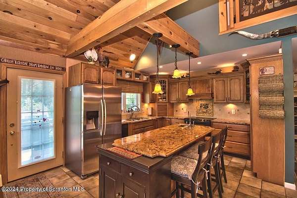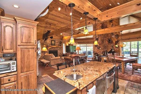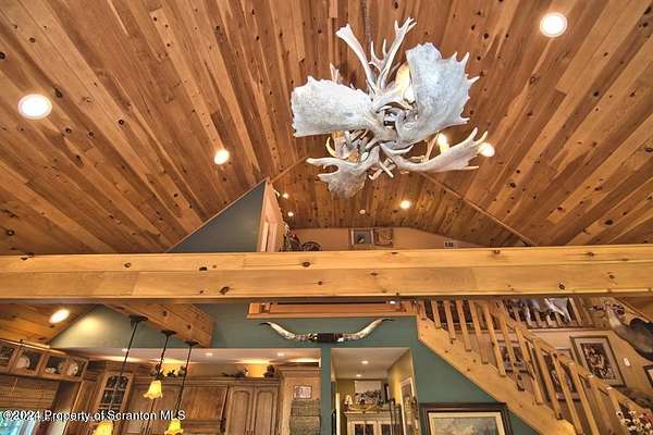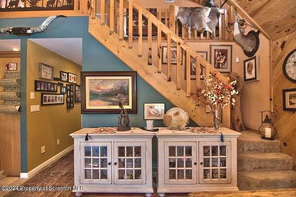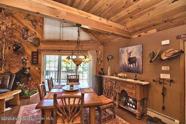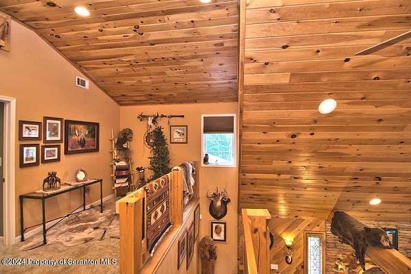Special accents from all over the world, welcome you to this custom built Contemporary on 45+ country acres. This nature lovers paradise is surrounded by the pristine NEPA mountains. Natural twisted juniper mantle, light fixtures from Italy, gorgeous sink from Mexico, and many more tributes to travel memories. The heart of every home is the kitchen. This gourmet kitchen boasts granite counters, hickory cabinets, touch faucet, and stainless appliances. Easy flow into from the Great room and Dining room. Enjoy gorgeous views of all 4 seasons through soaring floor to ceiling windows while relaxing in front of your stone gas fireplace. This focal point features Hand hewn ceiling beams, cathedral ceilings, tongue and groove and plenty of natural light. Glass doors open to your spectacular deck with covered pergola where you can enjoy entertaining. Master bedroom ensuite bath w/glass doors leading to deck, light up stone sink and Jacuzzi tub. Other exceptional features include central AC, laser cut metal screen, Stained glass door panels and shutters, ceramic tile baths and central vac. Finished lower level makes the perfect space for entertaining, complete with wetbar, 3/4 bath, 3 potential bedrooms. Can be used as guest or in-law suite. Sliders lead to your perfect tranquil setting. Stone patio, rear yard, beautifully landscaped, plenty of wildlife. Koi pond is full of many different beautiful types and is a wonderful swimming pond. Dock, gazebo with electric & fountain are a perfect peaceful setting to relax. Pride in ownership is evident throughout the entire property. 4 car garage with drive-thru bay, outbuildings and barn offer plenty of storage. Immaculate and turn key ready. Over 3500 sq ft of living space, perfect for lots of family, friends & guests. Welcome home to your very own personal retreat. Close to Elk Mountain. All equipment is negotiable.