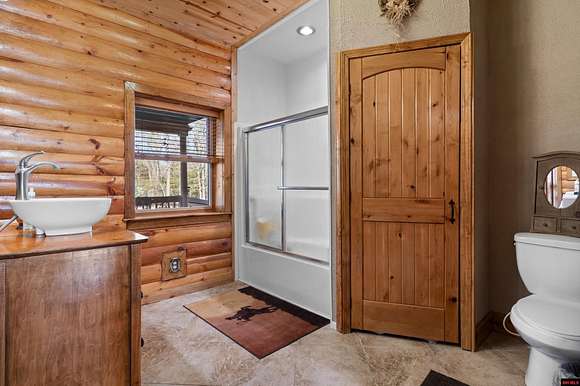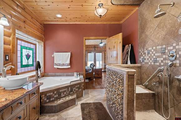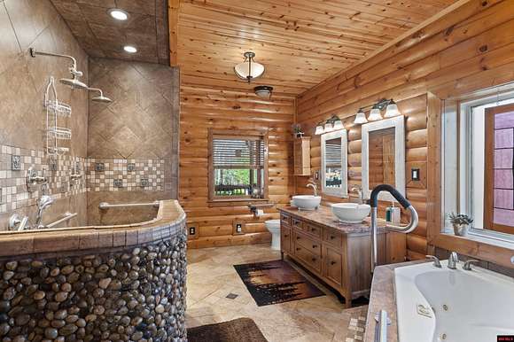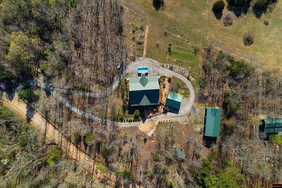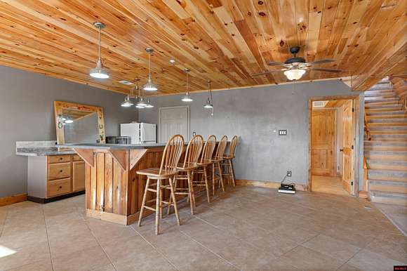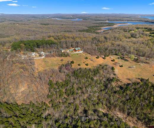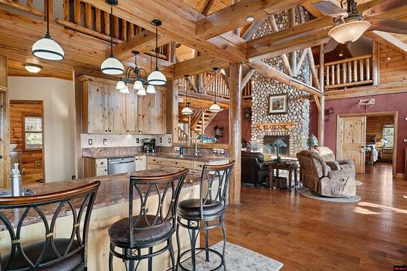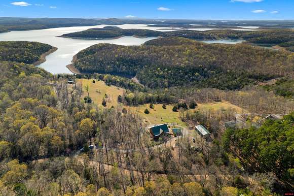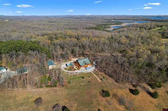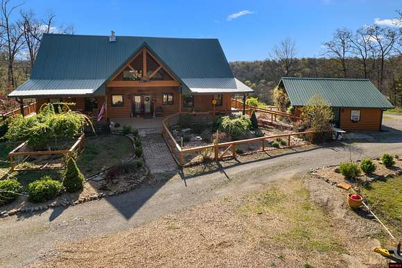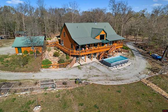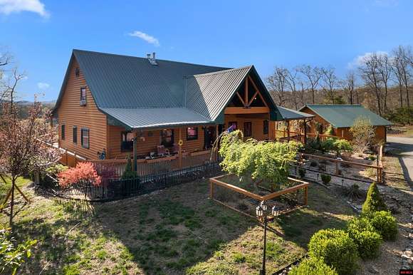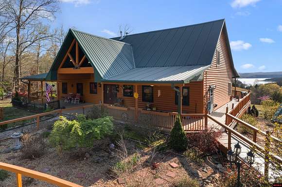 No expense was spared in this stunning 3/4 bedroom, 3 bath open-concept log home located in Oakland that boosts a wraparound porch with year around view of Bull Shoals Lake. Constructed in 2018, this home is situated on 10 AC M/L that border corps property. Don't overlook the impressive 25' rock dual-sided fireplace in the living room, as well as the cozy movie room downstairs. The home features durable 12" ICF walls, a fire sprinkler system, and a safe room for your comfort and safety. The kitchen boasts granite countertops, alder cabinets, a large island, and a pantry. The primary bath includes a stone walk-in shower and a luxurious jacuzzi tub. Outside, you'll discover a detached two-car garage, a 30 x 60 shop, a spacious carport, 12 x 30 pool and a fruit orchard. Downstairs, there's an additional family/rec room complete with a wood-burning fireplace, wet bar, and plenty of storage space. Both association water and well water are available.