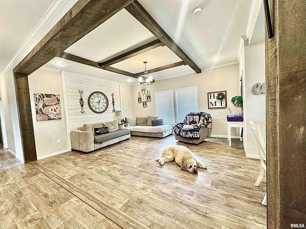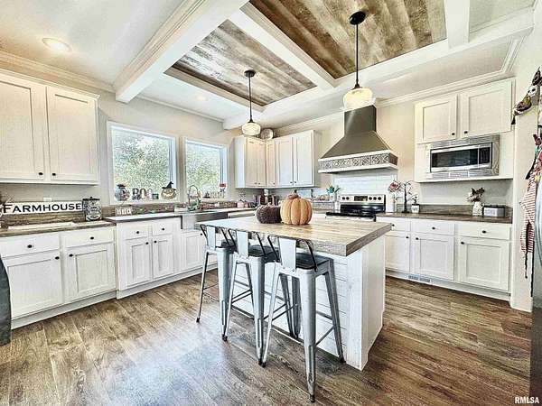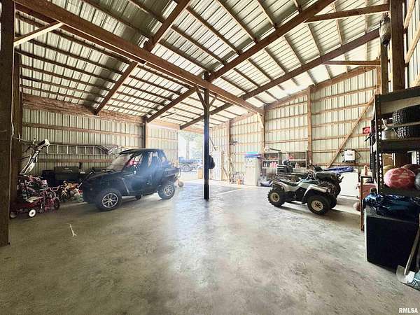 This gorgeous 2020 Clayton Southern Charm home truly lives up to its name! Sitting on over 2 acres in the Rome Grade and Woodlawn High School district, it features 4 bedrooms, 2.5 baths, and a 32x32 pole barn with a concrete floor. Thoughtful upgrades include a pitched roof and 9-foot ceilings that make every room feel open and inviting. Step inside to a spacious living area with exposed beams and a shiplap accent wall with a fireplace feature that adds the perfect farmhouse touch. The kitchen is a showstopper with stainless steel appliances, a farmhouse sink, an island with seating, and a tray ceiling accented with warm wood planks. You'll love the metal tiles on the range hood, the bright white cabinets, and the walk-in pantry that connects to the utility room for added convenience. The primary suite feels like a retreat, featuring sliding barn doors that lead to a spa-like bath with a soaking tub, double vanity, and walk-in shower. There's even a built-in desk nook that's ideal for work or study. With peaceful country views, modern finishes, and plenty of space to spread out, this home blends comfort, charm, and functionality beautifully.