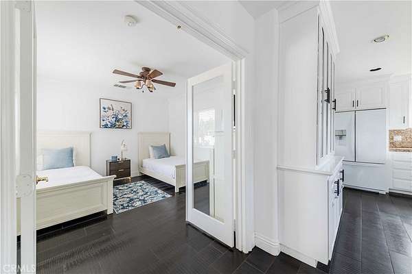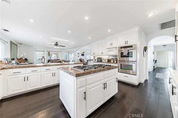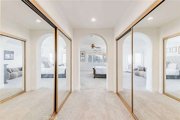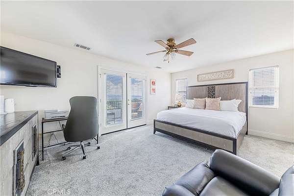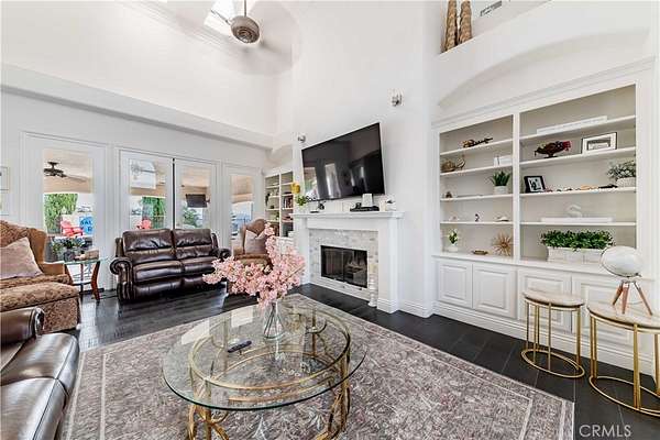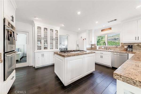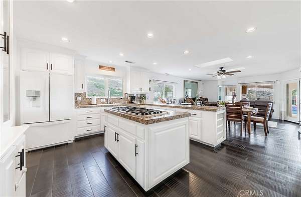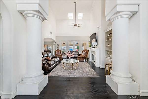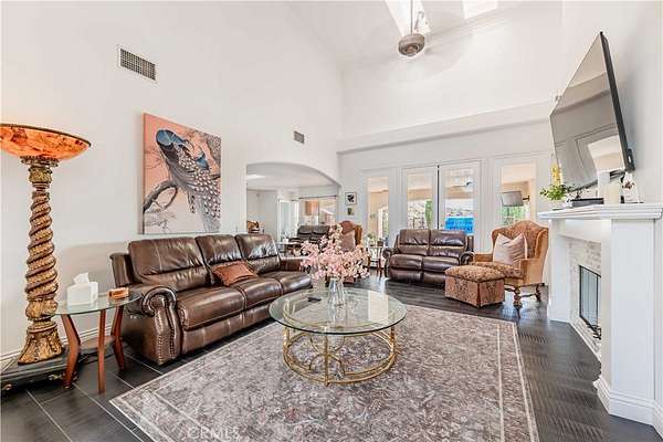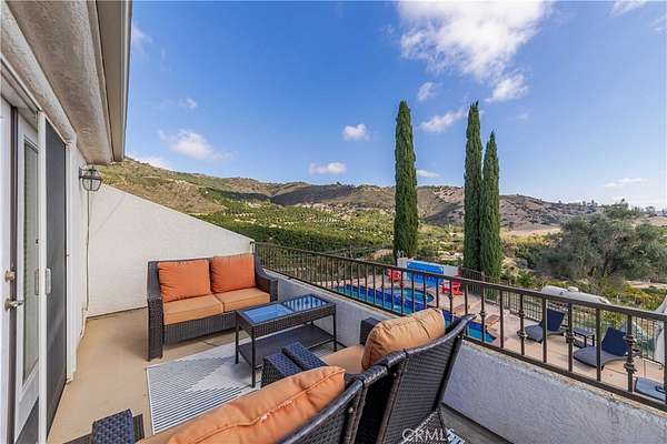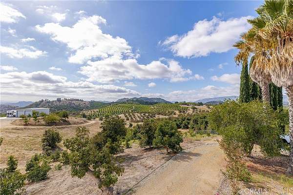 The home spans over 3,000 square feet of refined living space, beginning with a grand entry framed by soaring 20-foot ceilings and flooded with natural light. The great room showcases Italian-inspired architectural columns, custom built-ins, and an elegant fireplace that sets the tone for the rest of the residence. The gourmet kitchen is designed for both function and entertaining, featuring a large island with 6-burner cooktop, granite countertops, custom cabinetry, double convection ovens, abundant storage, and an effortless flow into the dining and family room areas. Living is easy on the main floor thanks to a spacious primary suite complete with dual walk-in closets, his-and-hers sinks, a vanity, oversized soaking tub, and a large walk-in shower. French doors open directly to the backyard, providing seamless access to the resort-style pool, heated spa, and covered outdoor entertaining area with wet bar and sink. The downstairs also includes a versatile 4th bedroom or office with French doors. Upstairs, two expansive bedroom suites each offer private balconies with sweeping vistas of the surrounding groves and hills. The grounds offer endless possibilities--gentle terrain ideal for vineyards, additional orchards, future guest house construction, or a sports court. A steel workshop/RV barn with electricity, oversized three-car garage, excellent security system, central vacuum, and extensive parking for 12+ vehicles round out this exceptional property. This is more than a home--it is a rare hilltop sanctuary blending luxury, privacy, natural beauty, and agricultural potential into one extraordinary offering.
