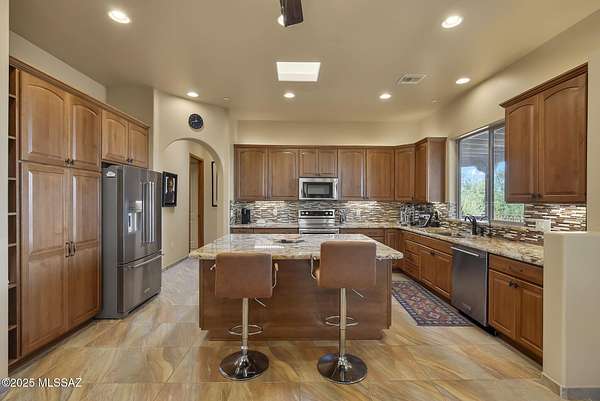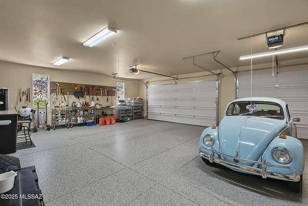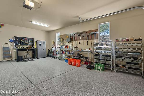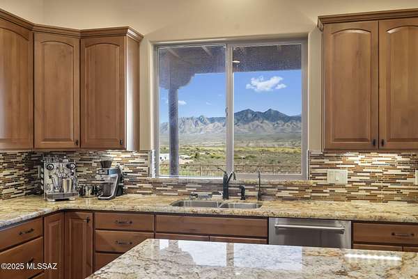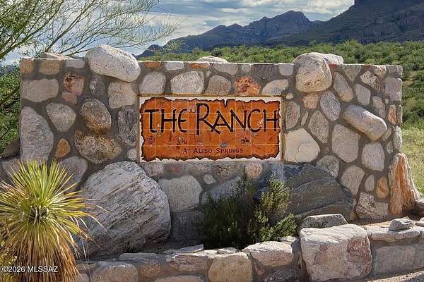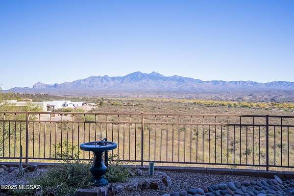 Tucked away behind private gates in The Ranch at Aliso Springs, this exceptional showplace residence delivers a rare blend of serenity and Southern Arizona architectural grandeur. Set on 4+ sweeping acres, the home captures unobstructed mountain panoramas that shift with the sun. Inside you'll find a thoughtful layout anchored by two generous bedrooms, each featuring direct terrace access, plus a versatile flex space, ideal for a den or studio. The heart of the home is the open gathering area, where huge picture windows and a seamless indoor-outdoor flow make entertaining effortless. Expansive covered and open outdoor areas offer room to garden, explore or simply relax. Large three-bay garage features dedicated workshop and epoxy flooring, ideal for both hobbyists and car aficionados.