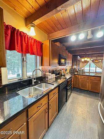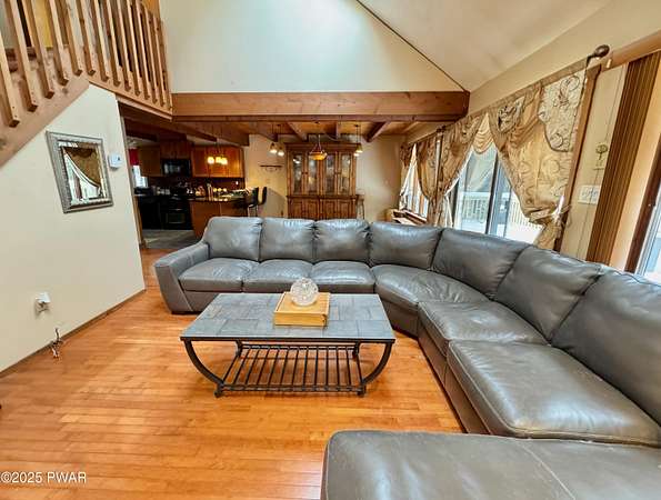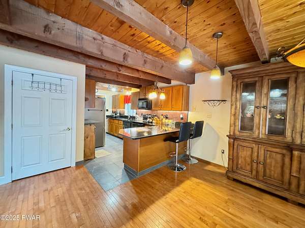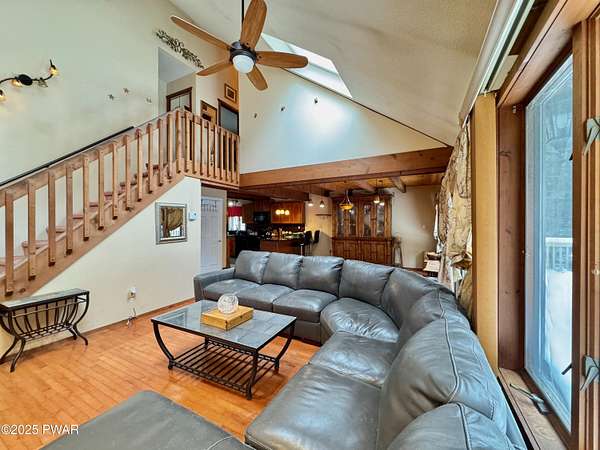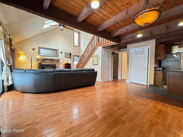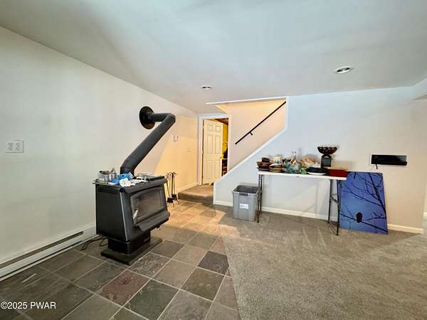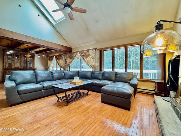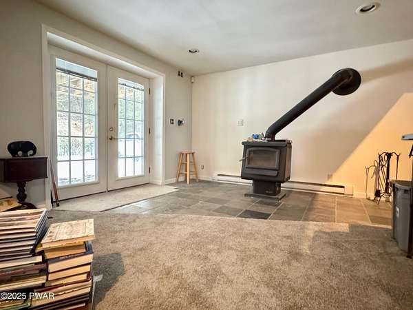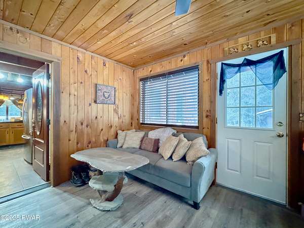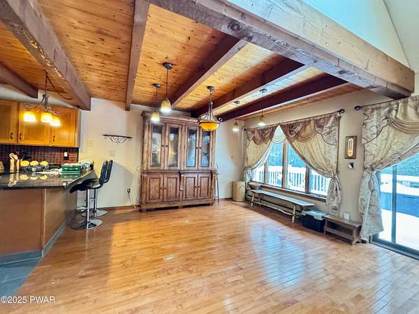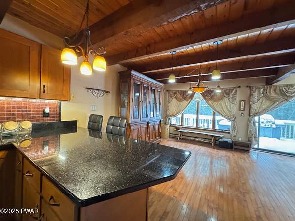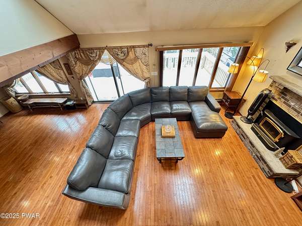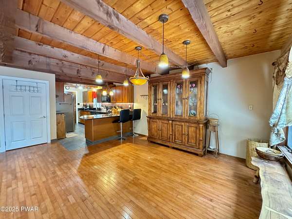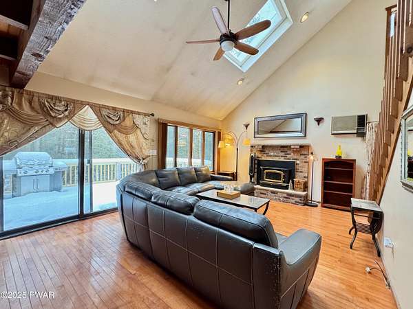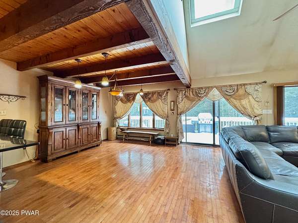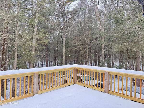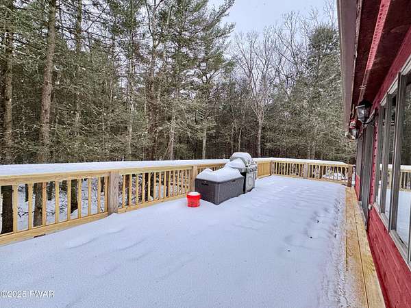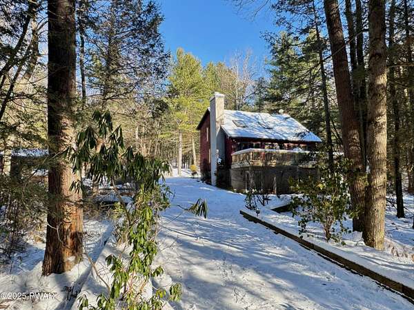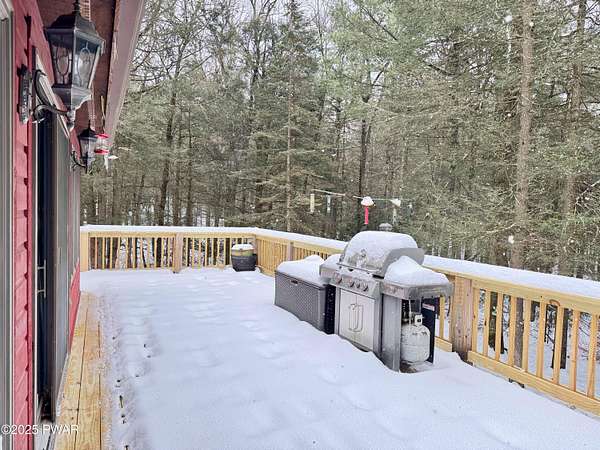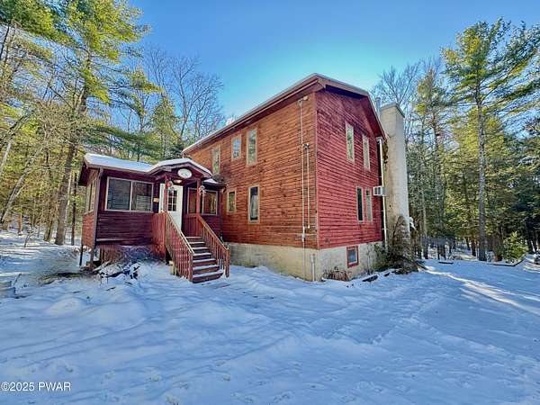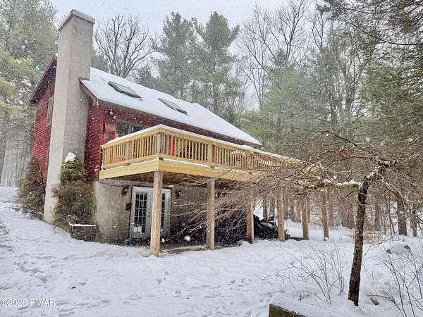 Step inside this country contemporary home and you'll immediately feel the calm of nature and the comfort of space all around you. The open main level is filled with natural light streaming through the many windows, giving you the sense of living right in the forest. The living and dining rooms connect beautifully, highlighted by maple hardwood floors and a brick-faced fireplace with a wood-burning insert--perfect for cozy evenings. When the weather's just right, step out onto the wrap around deck from either room and enjoy the peace and privacy of the surrounding woods. There's an undeniably cool character to the way this home blends contemporary design with its natural surroundings. The kitchen is a functional gourmet space designed for everyday cooking and entertaining, complete with a handy breakfast bar for quick meals or extra prep space. The main level also offers a bedroom and full bath for added convenience. The updated, fully finished basement expands the home's possibilities with a walk-out family room featuring a wood-burning stove and new carpet, a spacious laundry and storage area, and a dedicated workshop. With its layout and extra square footage, this lower level offers so many options for how you want to use the space. All of this sits on 2.27 private acres along a quiet country road, with serene woodland views. The property also includes a detached garage and a small fenced area perfect for pets -- and yes, there's even a generator for peace of mind in all seasons. It's a beautiful spot with easy access to a nearby trout stream, Lake Wallenpaupack, and Interstate 84.