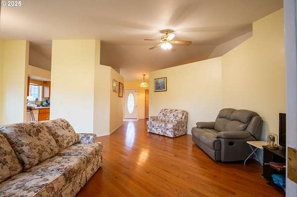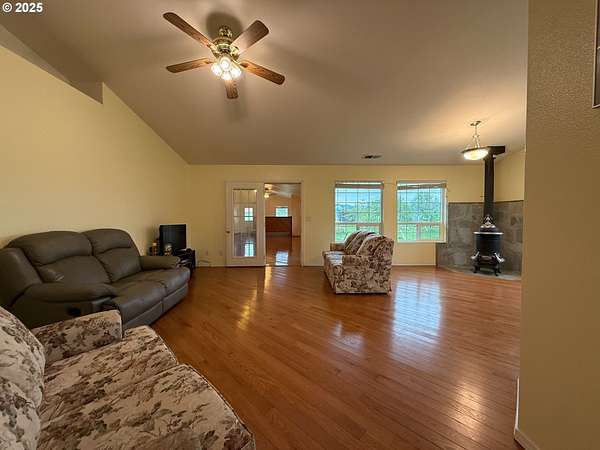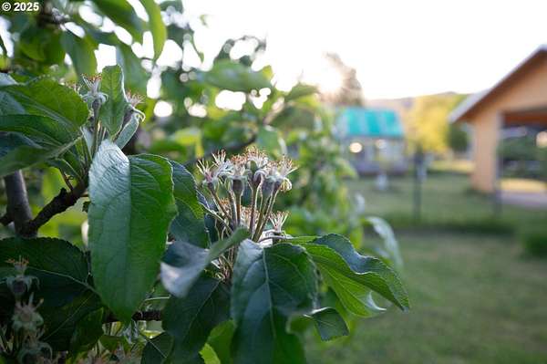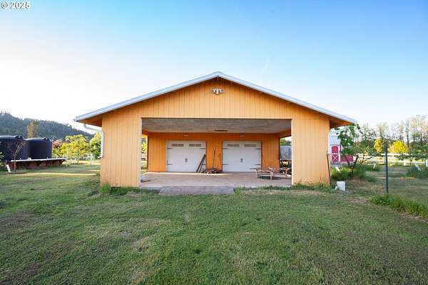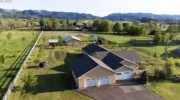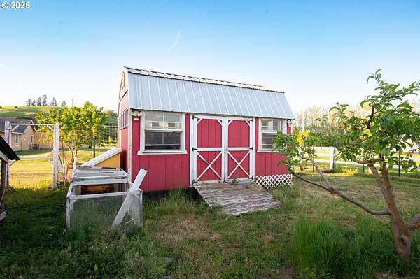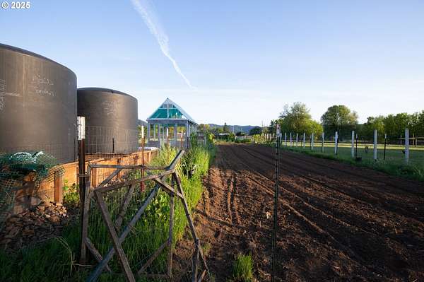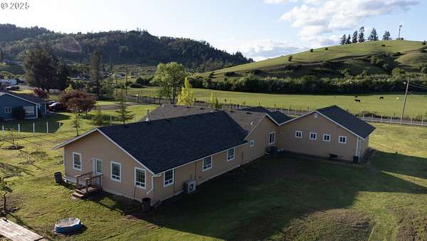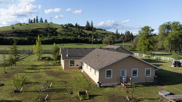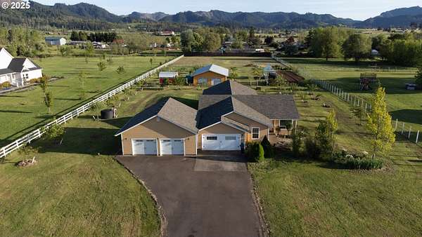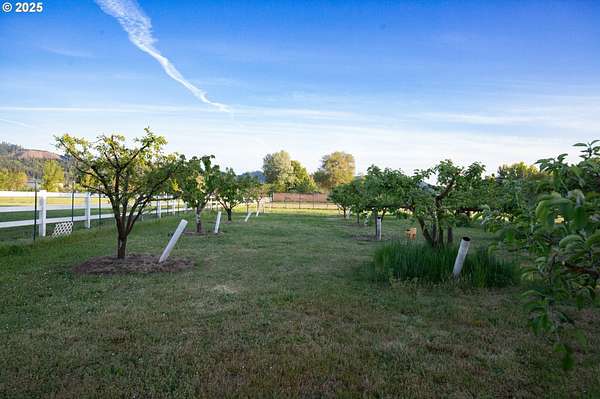 Rare opportunity to own flat land in this area! 4 bedroom 2 bath 3457 sq ft one level home is nestled on 2.46 flat acres and boasts beautiful hardwood floors and marble tile throughout. This home features a 1500 gallon holding tank and UV filter for drinking water. New roof installed February 2025 on the original house. New air conditioner March 2025. The home also has several new windows. The 31x38 great room with a corner bar is a must see and offers many opportunities!! Original garage was converted into a utility room/mudroom with 2 additional rooms perfect for storage, workout equipment, etc. 25x30 garage with power added in 2013. Orchard provides multiple varieties of fruit and nut trees (55 total) have been meticulously cared for, including Apple, cherry, fig, nectarine, peach, pear, plum, dates, figs, pomegranate, persimmon, hazelnut, and almonds. Fenced in garden also has thornless blackberries ,raspberries, and gooseberry plants. Detached 29x29 garage with power also has a covered patio. Large poultry coop and run are ready for your animals!!