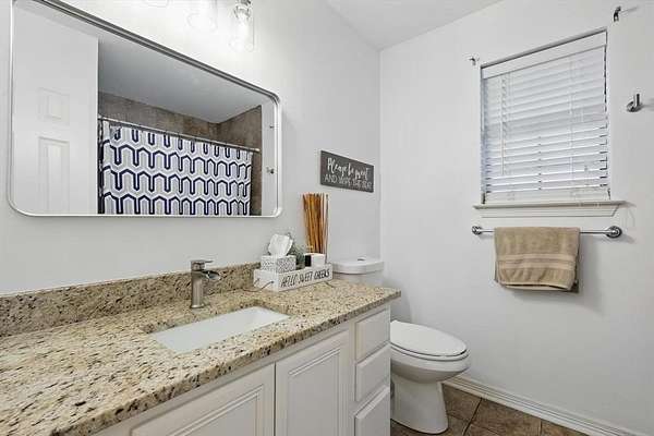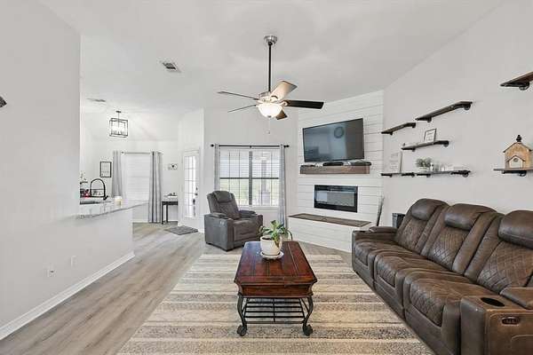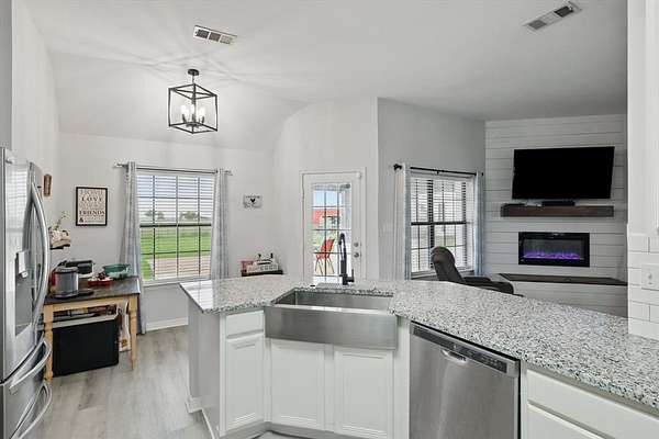 Inside, this home features four bedrooms, two baths, and a split floor plan. The oversized primary suite includes a bonus sitting area, perfect for a nursery, home office, or workout space. The open living room centers around a brick fireplace with cedar mantle and trey ceilings. The updated kitchen is complete with granite countertops, stainless steel appliances, custom backsplash, and a stainless apron sink. Throughout the home, you will find new flooring, fresh paint, and modern lighting.