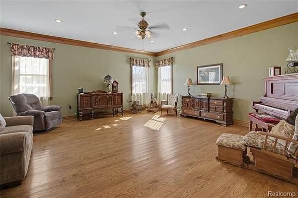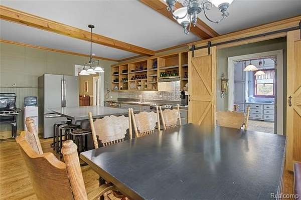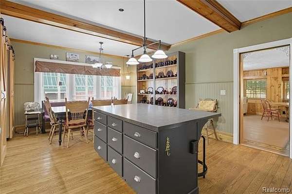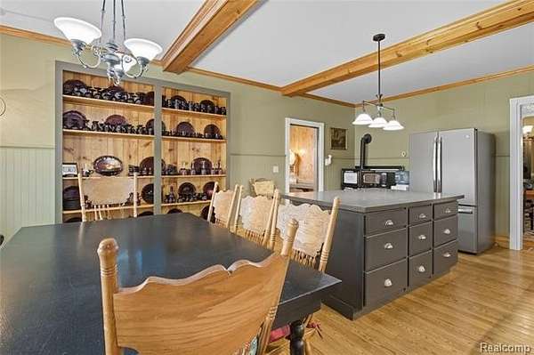 Inside, you'll find warm wood floors flowing throughout, a large eat-in kitchen with island, and a formal dining room ideal for gatherings. The bright sunroom offers peaceful views of the property, while multiple living spaces ensure comfort and functionality for the whole family. Outdoors, four versatile outbuildings include a 2-car garage, an extra large pole barn with electricity, a storage barn, and a shed--providing endless opportunities for hobbies, storage, or workspace.