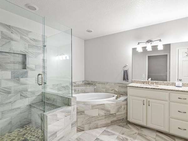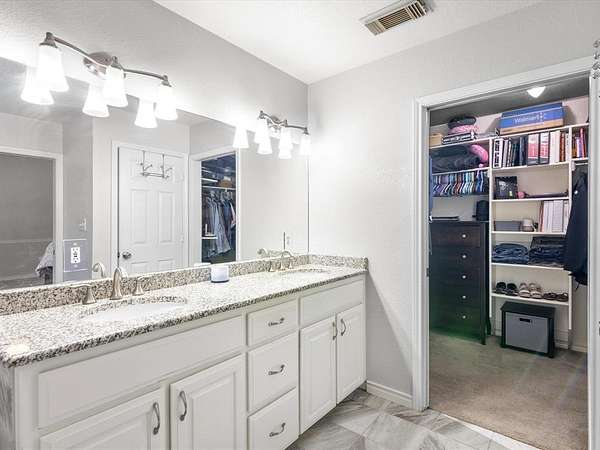 The primary suite is tucked away in a split bedroom layout, primary bath has dual granite vanities, a walk-in shower, soaking tub, and a walk-in closet with built-in shelving. Two secondary bedrooms share a Jack-and-Jill bath and the third has its own full bath. A half bath serves the main living areas.
