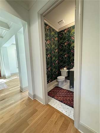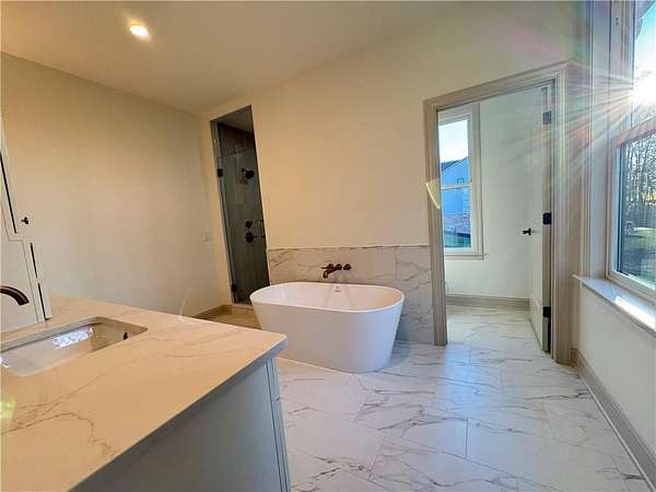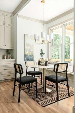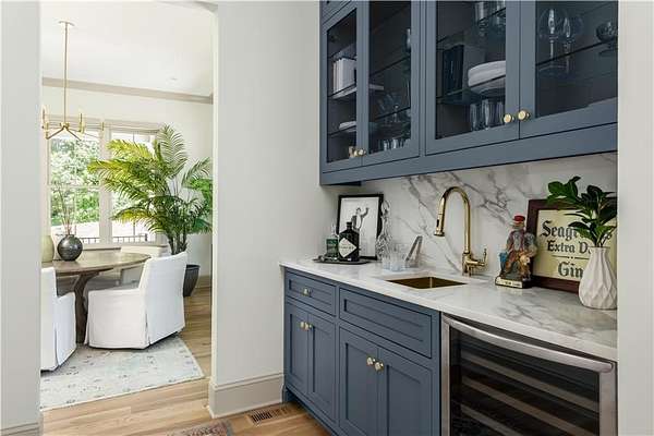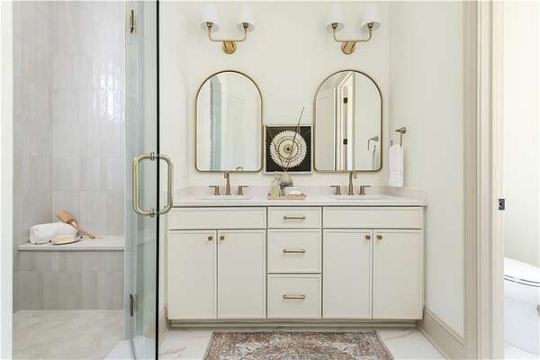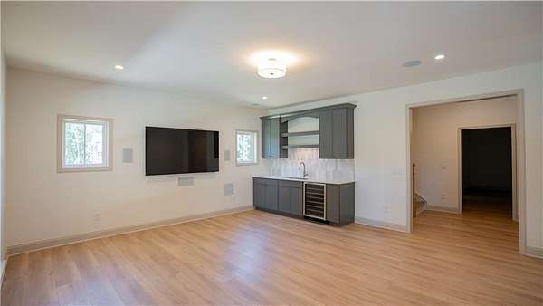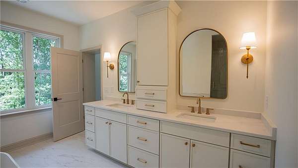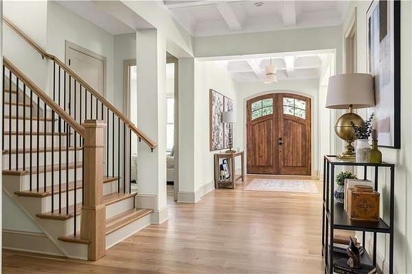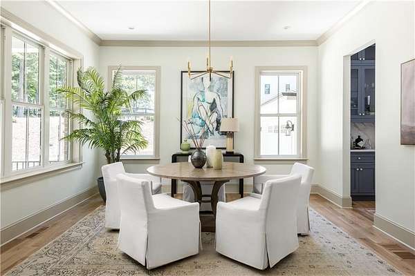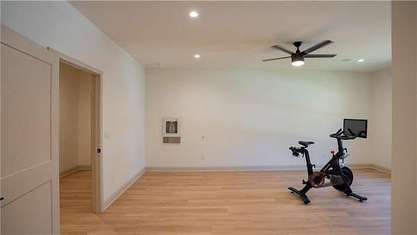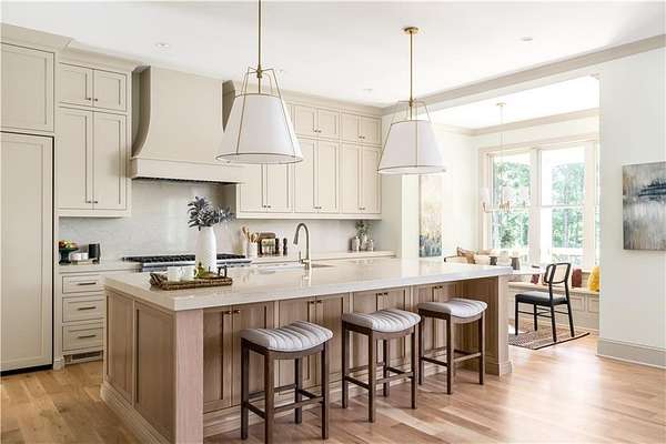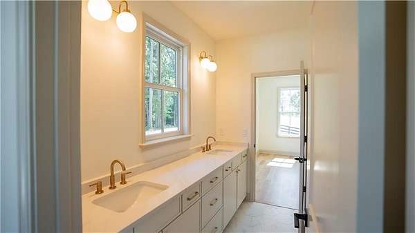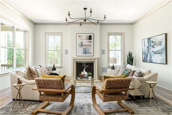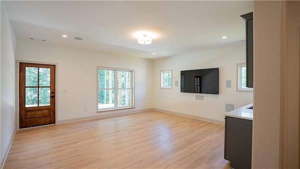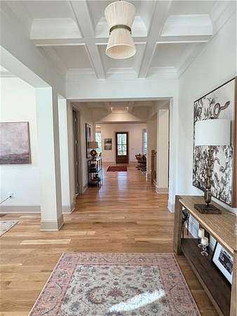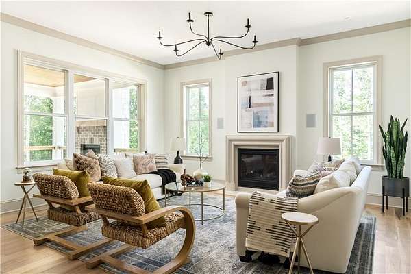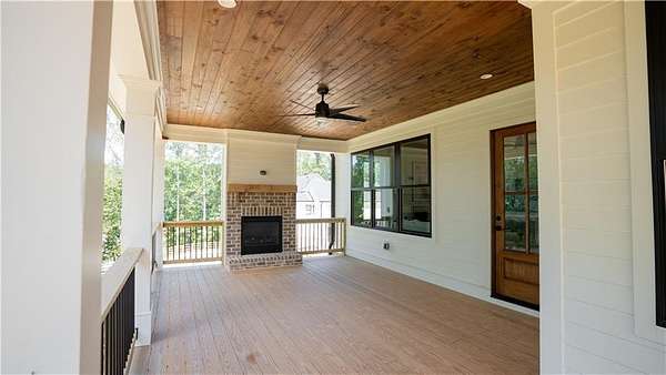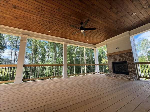This home is a sanctuary for those with discerning taste seeking to live in a custom home in the rolling hills of Woodstock, Georgia. Set in a private enclave of 5 luxury custom homes, on almost 2 acres, this home is centrally located to Woodstock, Milton, Roswell and minutes from Hickory Flat. Step through the douglas fir entry door and stroll through the coffered ceilings where you are greeted by a chefs kitchen with custom white oak inset cabinetry that stretches to the 10' ceiling and Cambria countertops with full slab backsplash and under cabinet and toe kick lighting. The centerpiece is a 48" Viking range with paneled Viking dish and Jenn Air fridge. The custom cabinetry continues into the pantry with ample prep space and the elegant butler's pantry where guests drinks can be served from a beverage fridge and a prep sink. A thoughtfully placed full primary on main ensures comfort and convenience for guests who are treated to a full ensuite bathroom and shower wrapped in Emser tile. A custom cast stone fireplace surround wraps a gas fireplace in the spacious living space with surround sound for an impromptu dance party. The back porch welcomes and provides the perfect vantage point to enjoy breathtaking views of the rolling pastures and refreshing breezes. Upstairs, the white oak flooring continues in all bedrooms to where each bedroom has a walk in closet and the two front bedrooms share a jack n jill bath. The primary suite is a retreat with a soaking tub and a spacious custom closet. In the terrace level there is 5.1 surround in both the family room and in the golf simulator/theater room. A home office will fit perfectly overlooking the serenity of the backyard. The wellness room is appointed with an elkay bottle filler and in ceiling speakers. Underdeck on the terrace patio allows more outdoor living space.