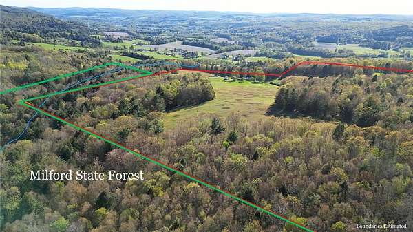 Welcome to your idyllic, once in a lifetime, hilltop paradise. Once known as Adaca Acres, this farmstead has been lovingly maintained, and now presents an unparalleled opportunity which will appeal in a multitude of ways. This property offers a serene rural retreat, nestled amid rolling hills and lush greenery, where the air is crisp and the views stretch for miles. Away from city lights the night sky is a breathtaking expanse, punctuated by thousands of stars. This tranquil property offers a perfect blend of privacy and natural beauty, making it an ideal escape from the hustle and bustle of city life. The home itself is a cozy, older farmhouse imbued with a nautical theme; the first floor offers ample living area composed of an eat-in kitchen (with woodstove), bedroom with en-suite full bath, spacious living room, laundry, and a delightful front porch, while an agile ascent up the stairs offers 2 more bedrooms and a full bath. Words do not convey the majesty of the landscape. Former agrarian fields and ponds roll in front of your eyes, while access roads lead into the mixed upland woods (including a sweet section of stream right next to the adjacent Milford State Forest land). The entire property is teeming with a diverse range of natural biodiversity and habitats for all manner of central NY wildlife. The property is enrolled in the NY 480a Forestry Management Program, resulting in managed timber stands and trails, incredibly low taxes, and planned timber harvests. Tucked away from busy roads, this property offers a true sense of solitude while still being accessible to nearby towns. The property is located 10 miles directly north of Oneonta with SUNY Oneonta and Hartwick College is very accessible from Interstate 88. Less than 30 minutes to Cooperstown and within one to two hours, one can be in Binghamton, Albany, or Syracuse and 15 minutes from Gilbert Lake State Park.