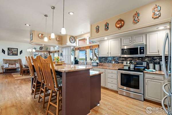 Est $6,865/moMeticulously maintained 15 acre parcel with irrigation water! Home has over 4,000 sf and features updated windows, wood floors, granite counters, basement with bar/fireplace, deck with bar, fireplace and hot tub. Premier team roping set up includes arena with covered stalls and roping boxes, pipe fence and Nelson waterers. Four stall barn has tack room and hay storage. The 48x60 shop has concrete, 14' doors, heat and air compressor. Addt'l 20x48 machine shed.