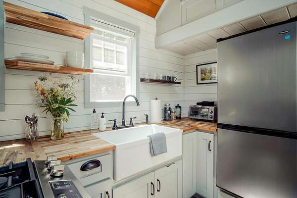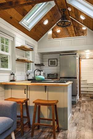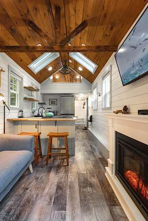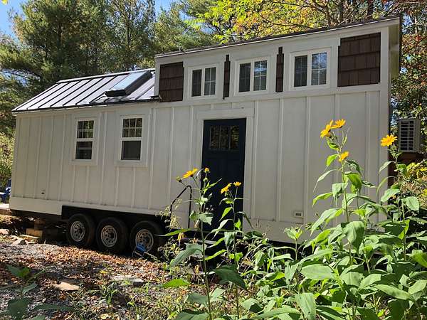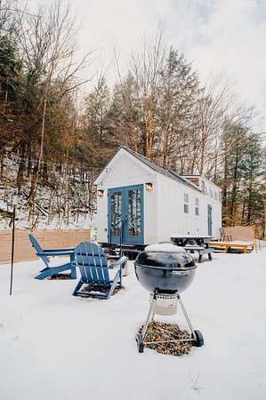 A unique tiny house offering contemporary, Vermont farmhouse luxury in the Green Mountains. Featured on A & E's Living Smaller! This is tiny house vacation living at its finest. The house offers a full kitchen with four-burner gas stove and oven, farmhouse sink, butcher-block countertops, electric fireplace, AC, 40" Smart TV, Starlink WiFi, small soaking bathtub with shower. The bedroom loft with queen bed is accessible by a full set of stairs. A wooded outdoor area with deck, patio, Solo stove, Weber grill, picnic table, and Adirondack chairs name a few features of your outdoor space. Love to hike? Just step out your door ! Come enjoy Vermont in a whole new way! This house lies in a wooded setting across the road from the Ball Mountain Brook. While outside, you can usually hear the brook flowing, which provides nice ambiance! You are just minutes away from some of the best attractions in Southern Vermont. The two nearby state parks, Townshend and Jamaica, have numerous overlook trails and the West River offers kayaking, rafting and tubing. Gourmet dining and designer outlets are a close drive to Manchester, Vermont. Spend a day on the slopes at one of the nearby ski resorts: Stratton, Bromley, Mount Snow, or Magic Mountain. This is the perfect get away to come to on a weekend or overnight. The house has great rental history. Property being sold "turn key". Sellers offering to continue as property managers. All buyers must be cash only. Limited showings due to rentals.