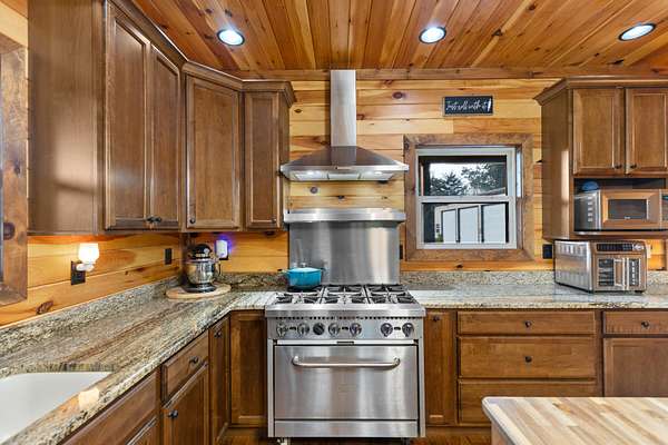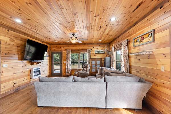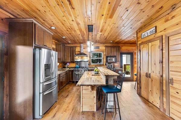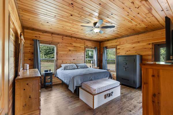 The home features an open floor plan with warm, cabin-like finishes, creating a welcoming retreat for both everyday living and entertaining. A wraparound porch provides the perfect space to enjoy the serene surroundings, whether you're sipping coffee at sunrise or relaxing at sunset looking over your large fenced front yard.
