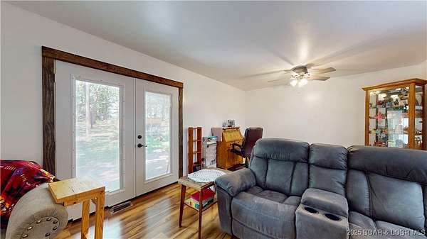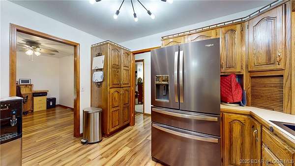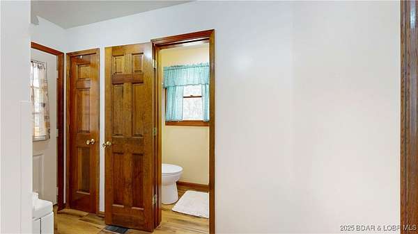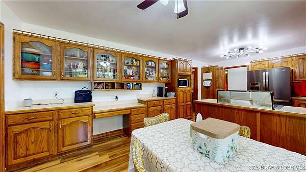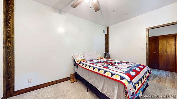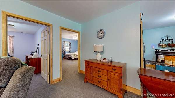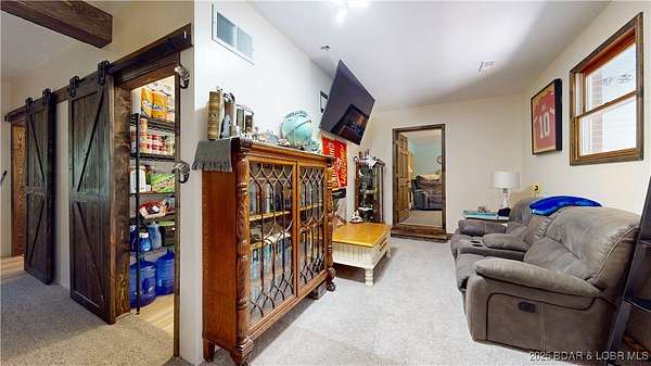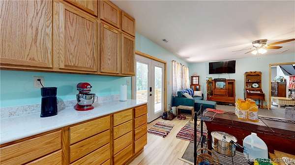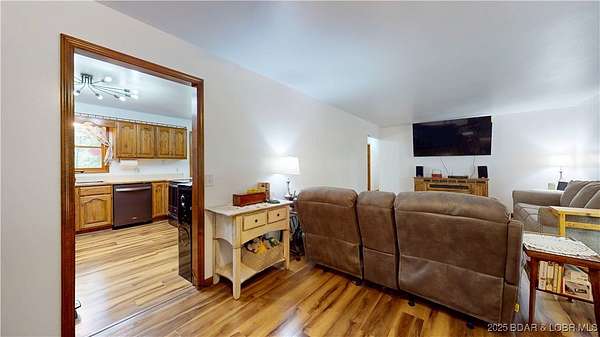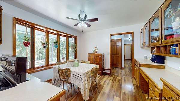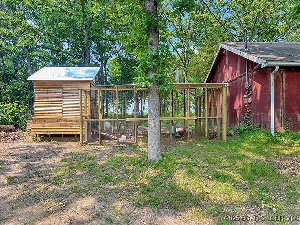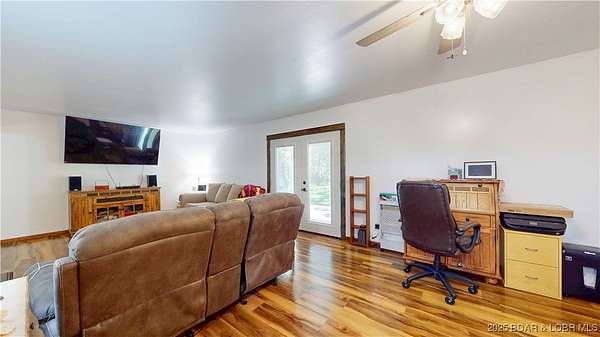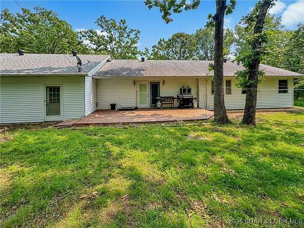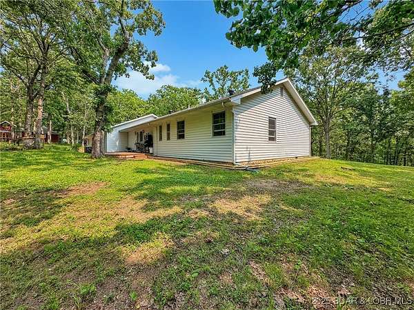 Nestled on a 22.99-acre lot with lush timber and wildlife, this ranch-style home offers privacy and convenience, minutes from downtown Warsaw, Lake of the Ozarks, and Truman Lake. It features dual living quarters on one floor, ideal for multi-generational living or guests. The original layout includes a cozy living room, 4 bedrooms, and 2.5 bathrooms. The large eat-in kitchen has ample cabinetry and a dining area with a bay window. A recent remodel added two bedrooms, a full bathroom, a family room, and a laundry room. The addition also includes a "Man Cave," walk-in pantry, and office/media room, with access to the crawl space, water heater, and water softener. Energy efficiency is highlighted with ground source heating and cooling in the original section and separate heating and AC in the remodeled attic. The home has a new roof and septic system for peace of mind. In total, the home offers 6 bedrooms, 3.5 bathrooms, 2 kitchens, 3 living areas, a pantry, and 2 dining areas. The detached garage/shop measures 24' x 36', with heat, and 220 service. The property also includes a chicken house and pen, and a rabbit house, perfect for nature enthusiasts and animal lovers.