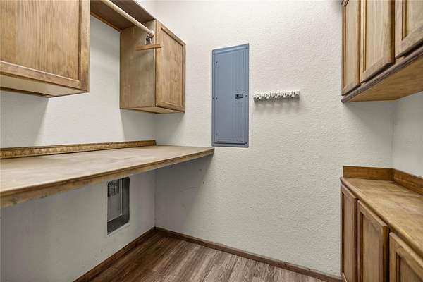 - Ceiling Fans(s), Eat-In Kitchen, L Dining, Primary Bedroom Main Floor, Solid Wood Cabinets, Split Bedroom, Stone Counters, Thermostat, Vaulted Ceiling(s), Walk-In Closet(s)