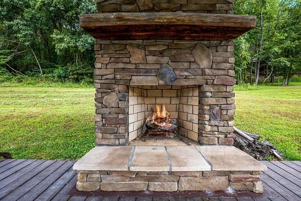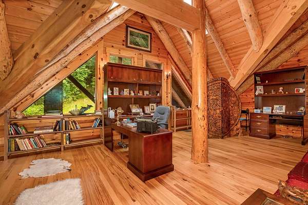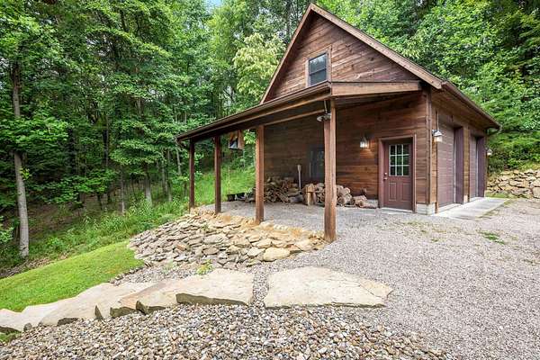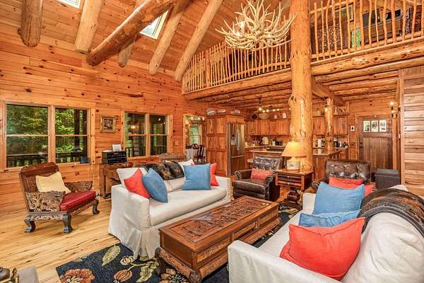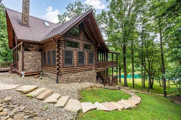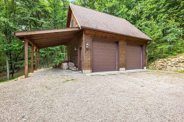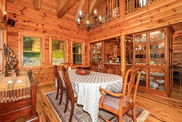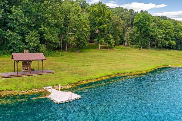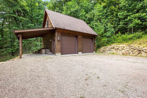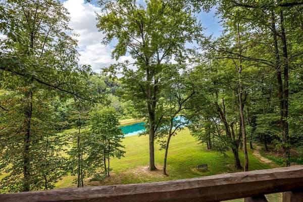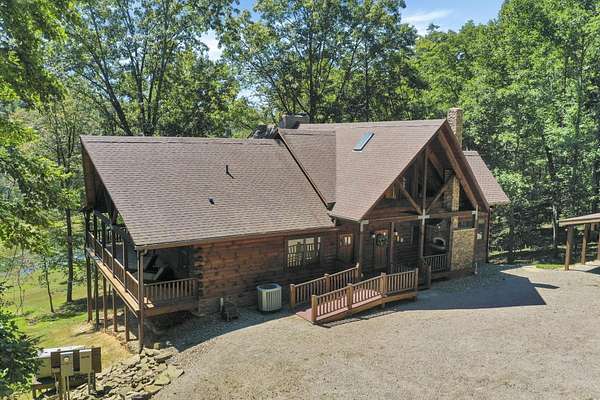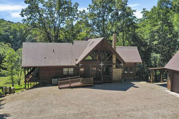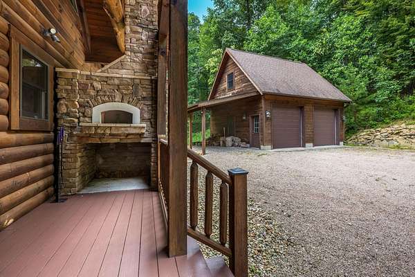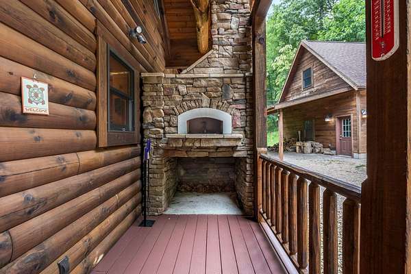 Discover the comfort of luxury living in this stunning custom Jubach Log Home, nestled on over 22 pristine acres. Spanning more than 4,000 square feet, this exquisite residence features 5 bedrooms and 2.5 tastefully appointed bathrooms, offering ample space for all to enjoy. Interior Features: Step inside to be greeted by the warmth of hardwood floors throughout. The heart of the house boasts a gourmet kitchen, equipped with a large gas stove and lovely granite countertops. The expansive living area is anchored by a magnificent double flue fireplace-one inside featuring gas logs for convenience and one on the outside deck for wood burning. For entertainment, experience your own private theater room, unwind in the cozy library on the lower level, and stay active in the dedicated workout room. The loft area serves as a perfect retreat for relaxation or recreation. A sophisticated wine cellar ensures your collection is stored perfectly, while surround sound speakers throughout enhance your living experience. Exterior Features: Venture outside to find wrap-around decks that invite you to bask in the natural beauty surrounding you. An inviting outdoor deck features a full ceramic wood-fired pizza oven, ideal for cozy nights spent enjoying homemade pizzas. Relish peaceful afternoons by your spring-fed lake, complete with a charming gazebo featuring a built-in fireplace. Protective covenants ensure privacy and tranquility, restricting rentals and preserving the serene atmosphere of this remarkable property. Also featuring a detached two-car garage with the potential for a finished second story. Being sold mostly furnished, this amazing property is not just a house; it's a lifestyle waiting for you to make it your own. Embrace the tranquility and elegance of country living while enjoying the comforts of a modern luxury log home. Your dream retreat awaits!