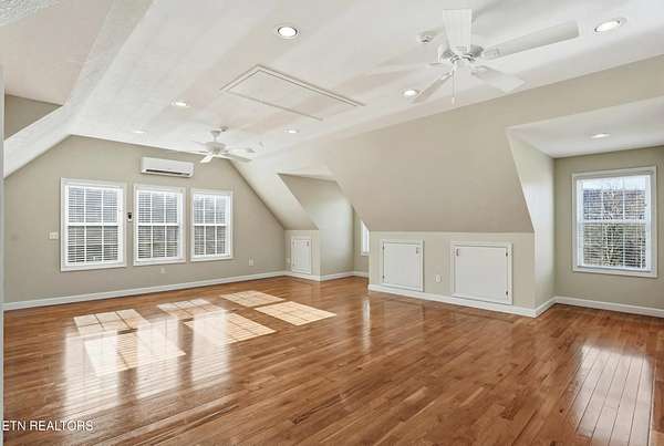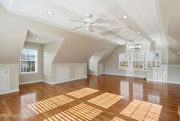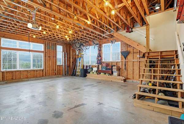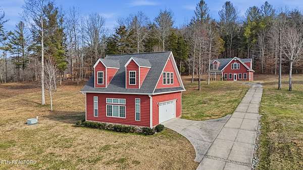 Privately positioned on 3.1 acres of meticulously maintained grounds in the prestigious Pinnacle Pointe community, this refined lakeview residence offers an exceptional blend of comfort, privacy, and scenic beauty overlooking Norris Lake, with peaceful views of the surrounding mountains, wooded landscapes, and abundant local wildlife. Expansive picture windows throughout the home capture tranquil lake vistas and natural scenery, filling each space with light and a sense of calm. The main level is thoughtfully designed for both everyday living and entertaining, featuring a spacious kitchen with solid stone countertops, stainless steel appliances, and generous room for a large dining table. The adjoining family room provides a warm, inviting atmosphere, complemented by a convenient half bath. Step outside to the large, covered porch--an ideal setting for morning coffee or evening relaxation while enjoying the peaceful lake backdrop. The upper level is anchored by a well-appointed primary suite with a private en-suite bath and direct access to the laundry room. A secondary bedroom with its own full bath offers comfortable accommodations for guests or family. A detached, oversized garage provides ample space for vehicles, tools, and recreational equipment. Above the garage, a beautifully finished 601-square-foot additional bedroom with a full bathroom and sweeping lake views offers exceptional flexibility, ideal for guests, extended family, or a private retreat. Both the main residence and the garage building feature concrete flooring on the main level for durability and ease of maintenance, while the upper levels showcase a refined blend of hardwood and tile. Set back from the road, the home offers enhanced privacy while still enjoying the amenities of Pinnacle Pointe, including a clubhouse, swimming pool, and marina. Residents may also reserve community pontoons by appointment for effortless days on the water.