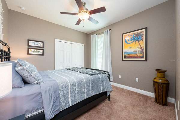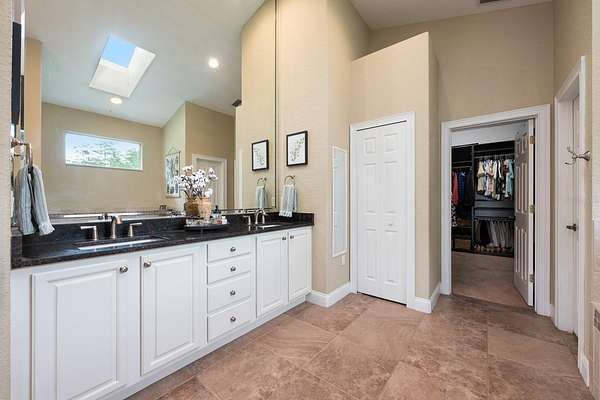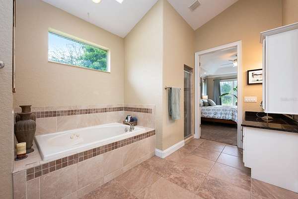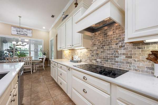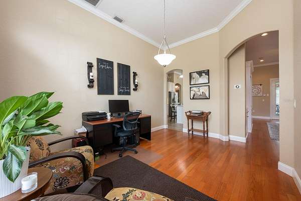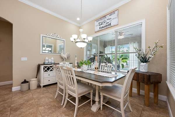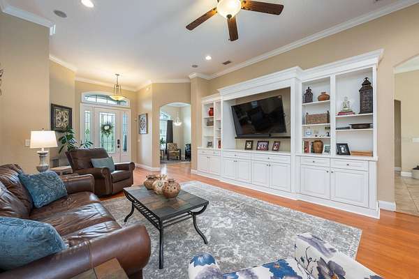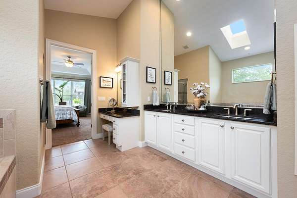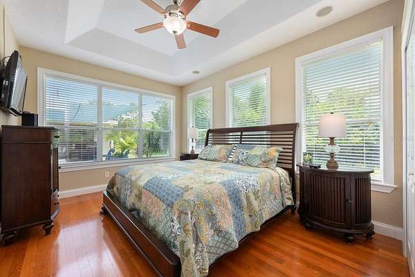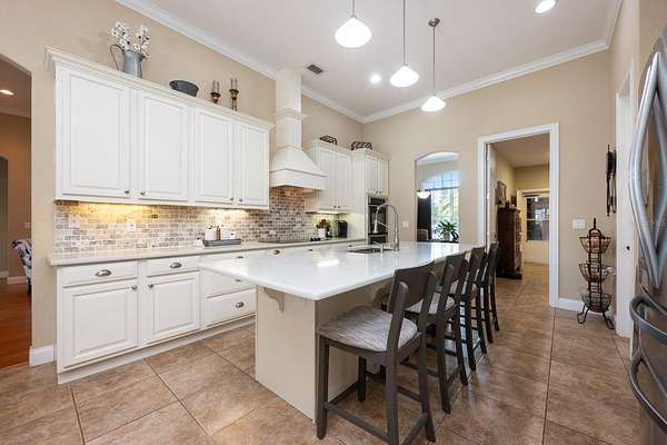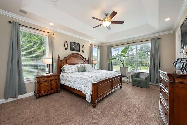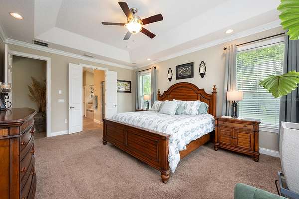 - Built-In Features, Ceiling Fans(s), Crown Molding, Eat-In Kitchen, High Ceilings, Primary Bedroom Main Floor, Solid Surface Counters, Solid Wood Cabinets, Split Bedroom, Stone Counters, Thermostat, Tray Ceiling(s), Walk-In Closet(s)