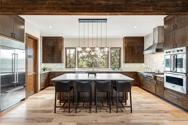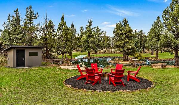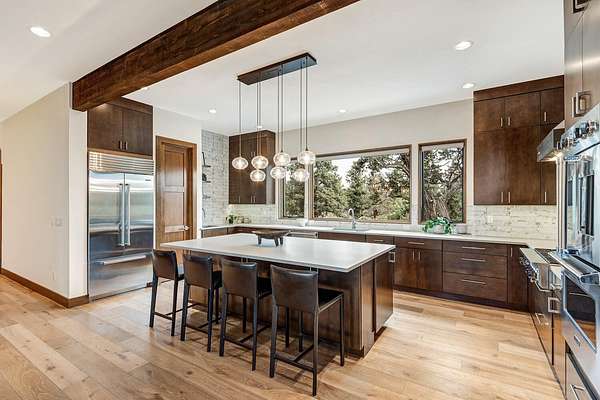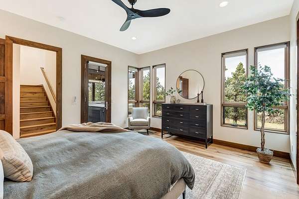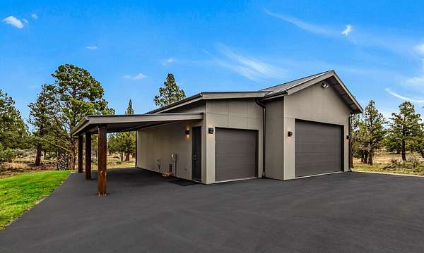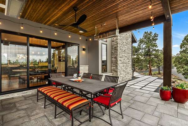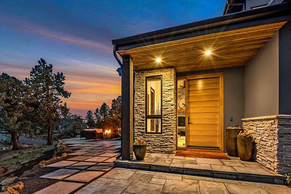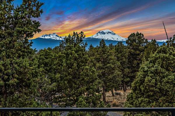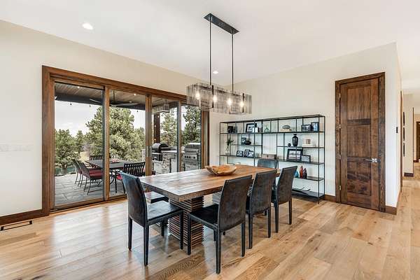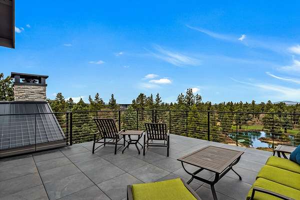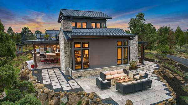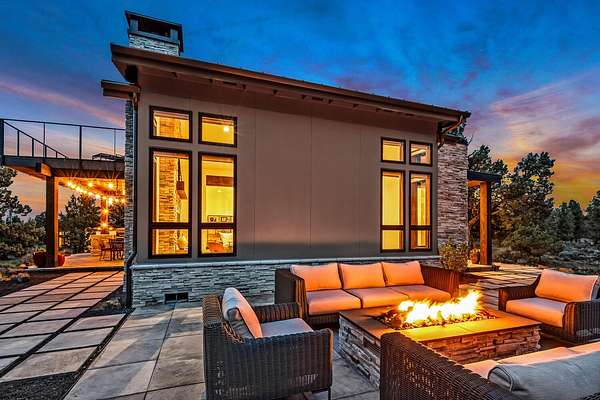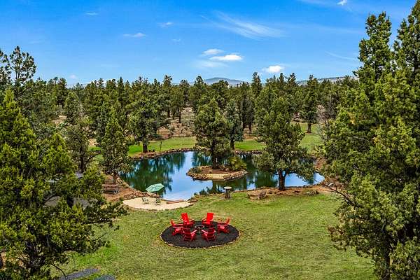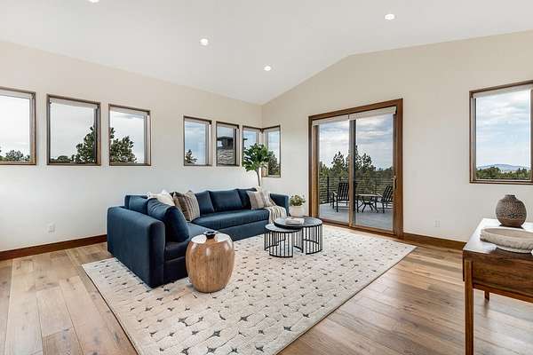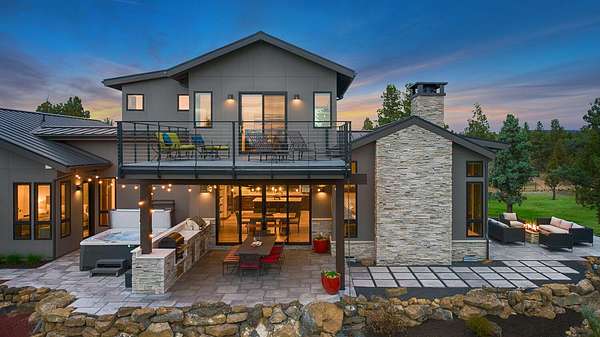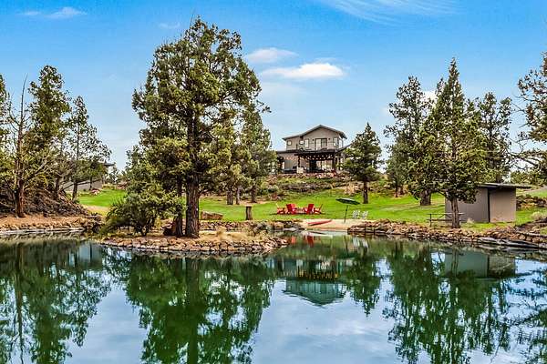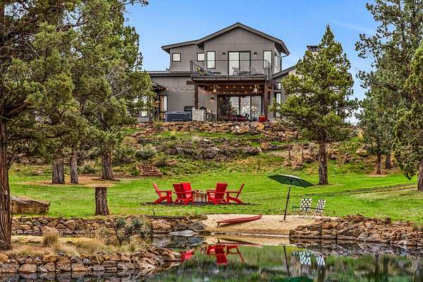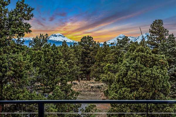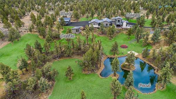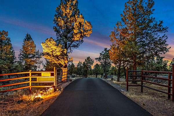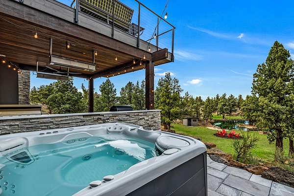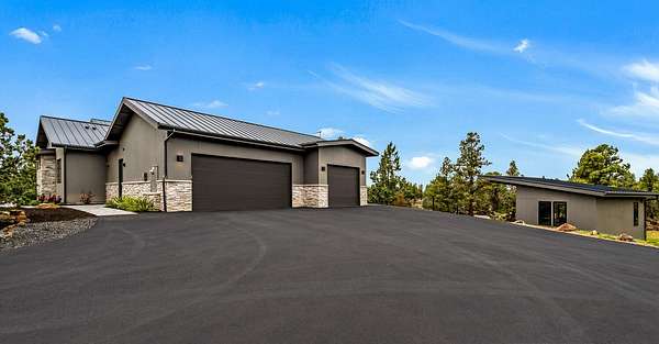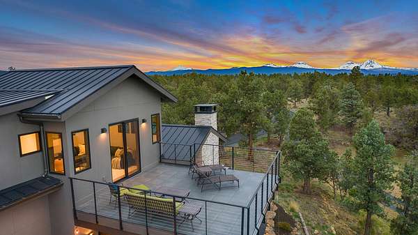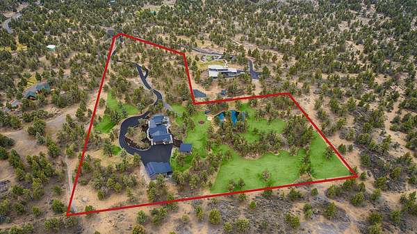 Newer custom construction on a private 9.02-acre homesite with a peaceful, protected setting, this Northwest contemporary stands apart in Bend's acreage market. Soaring ceilings, exposed beams, rich wood finishes, expansive windows, and a floor-to-ceiling stone fireplace create a home that feels both refined and connected to its setting. The showpiece kitchen, featuring Sub-Zero and Viking appliances, opens to the great room and dining area, while the main-level primary suite offers a private retreat with outdoor access to the saltwater hot tub. Upstairs, a flexible bonus space with full bath, mountain views, and rooftop patio creates ideal separation for guests, work, or relaxation. A detached casita, 3-bay shop with owned solar, 2.56 acres of Swalley irrigation, expansive patios, and sweeping territorial views complete this rare offering, all just minutes from Bend amenities.