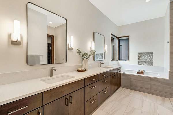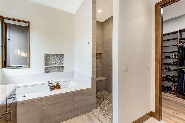 - Built-In Features, Ceiling Fan(s), Double Vanity, Kitchen Island, Linen Closet, Open Floorplan, Pantry, Primary Downstairs, Shower/Tub Combo, Smart Thermostat, Soaking Tub, Solid Surface Counters, Tile Shower, Vaulted Ceiling(s), Wired For Sound