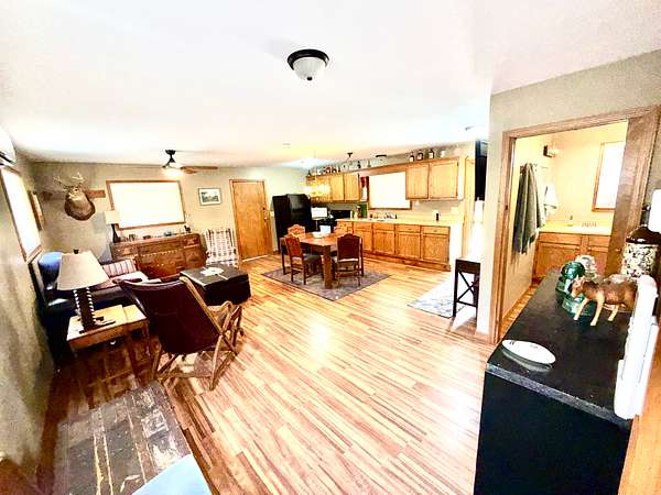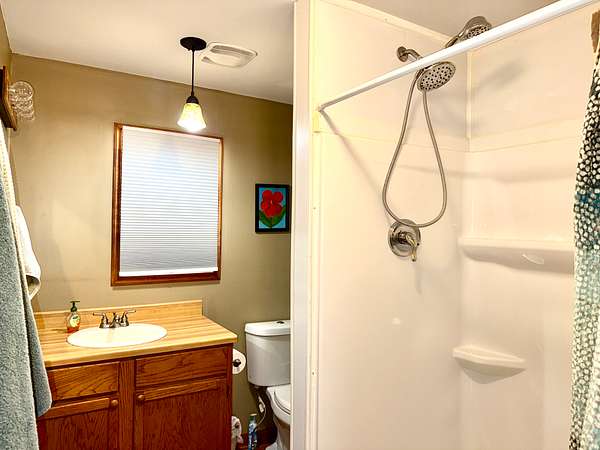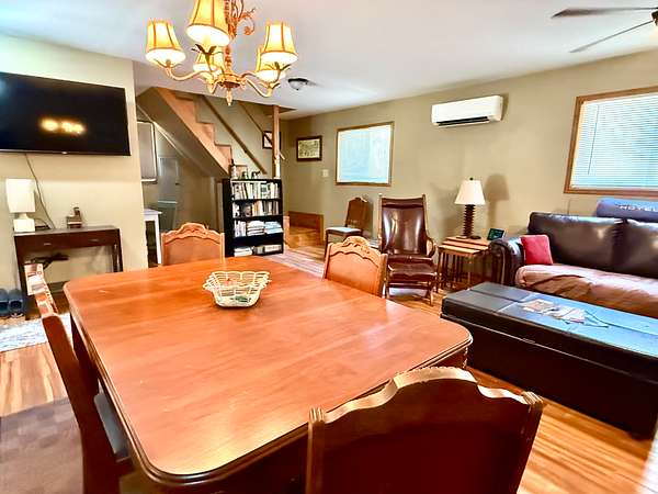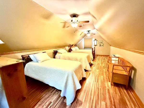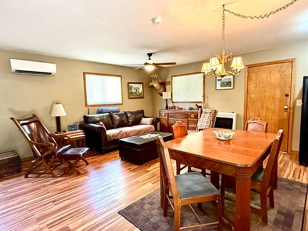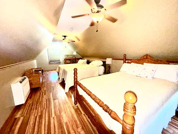 Inside, you'll find all appliances included, central heat and air, plus a gas wall heater for backup. The main floor features a spacious open living area with a full bathroom and walk-in shower. Upstairs, the cabin comfortably sleeps six.