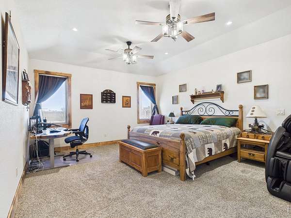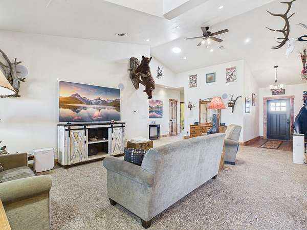 Looking for space to live, grow, or homestead? This 5 bedroom, 3 bathroom home on 3.88 acres in the Eaton School District offers 3,670 square feet with the flexibility and setup to support a wide range of needs. Garden spaces, several fruit trees, two chicken coops, and a heated shed create a property that is ready for country living, projects, and self sufficient pursuits. Inside, warm cabin character and mountain style comfort are found throughout the home. The main level features radiant in floor heating, and the primary suite has been updated with a new bathroom and upgraded closet. Multiple living areas provide room for everyday living, guests, hobbies, or work from home needs. A secondary entrance adds valuable flexibility for multigenerational living. A long list of improvements adds value throughout, so be sure to review the updates sheet for complete details. The 30 x 40 attached garage offers room for vehicles, storage, equipment, and a true workshop for cars or hobbies. Owned solar panels add long term value, while wide open views and unforgettable sunrise and sunset skies complete the setting. Schedule your showing and come experience the possibilities this property has to offer.