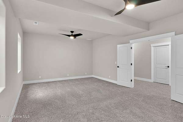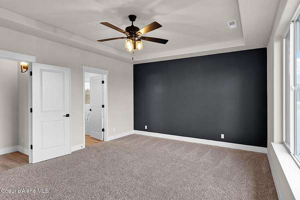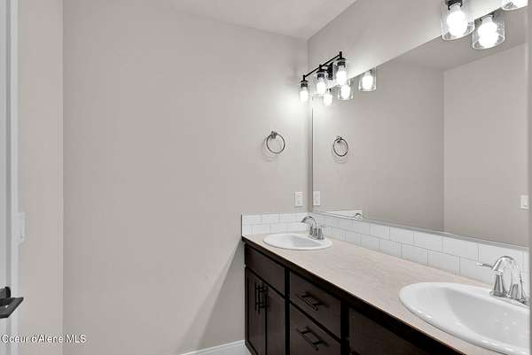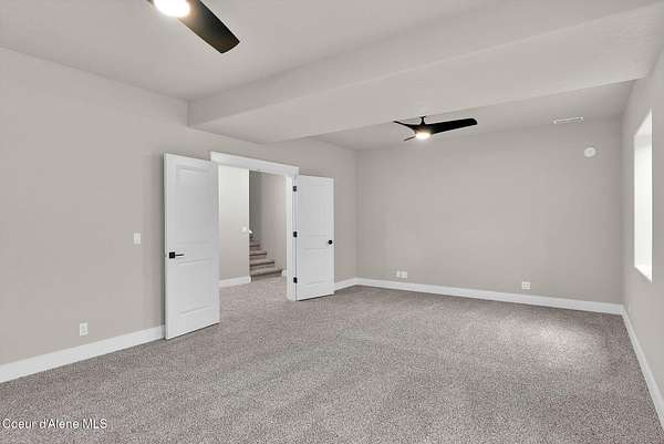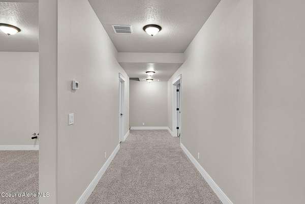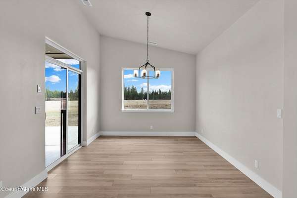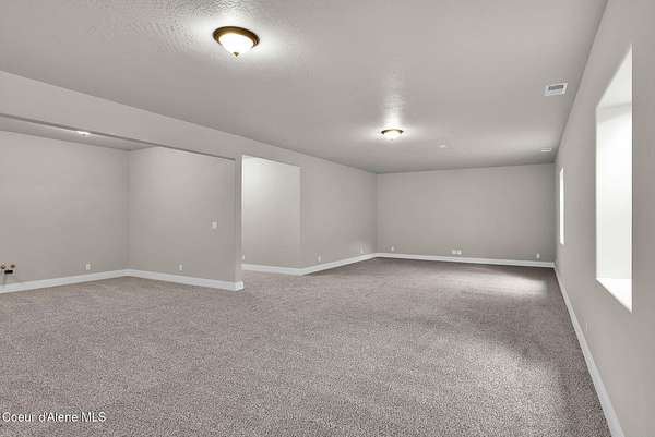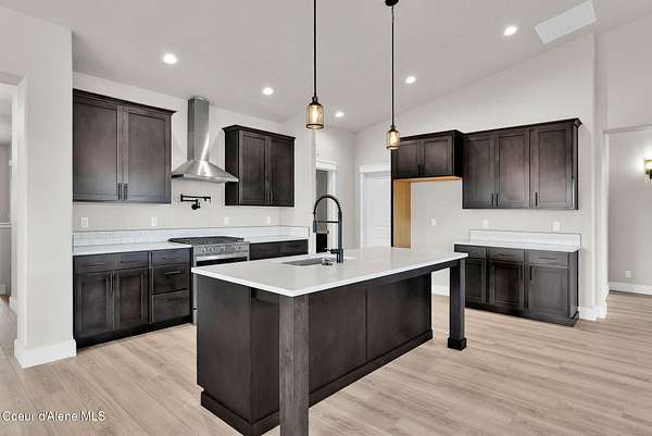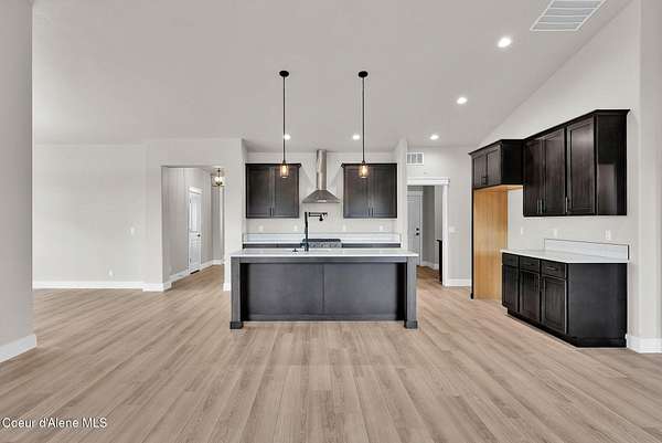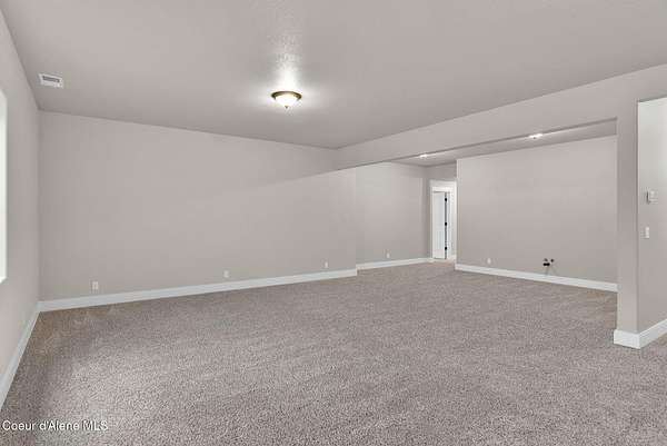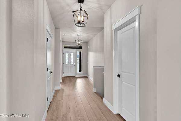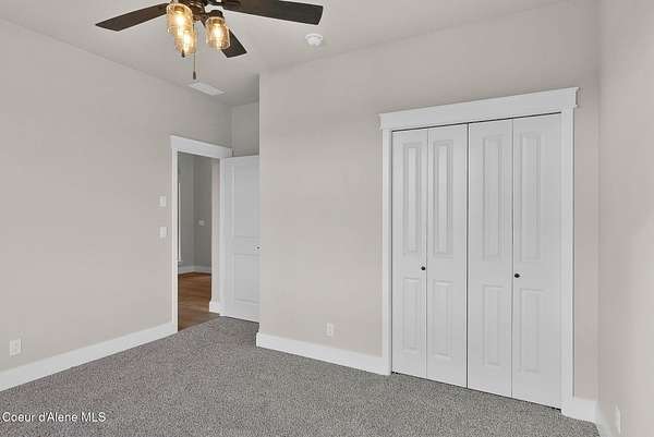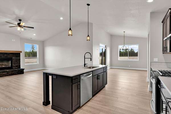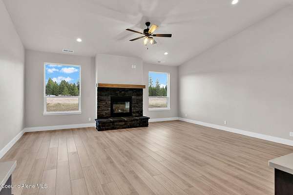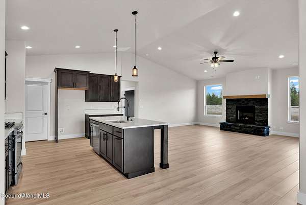 New Construction MOVE IN READY with Finished Basement!! This beautiful rancher plan with tons of upgrades sits on just under five acres with a view of Rathdrum mountain out the front. It features an oversized garage, stone accents, a covered front porch and a 14' x 18' covered back patio. Home includes cathedral ceilings throughout the family room, dining, and kitchen, and an open floor concept from the family room with gas fireplace, dining room and kitchen. Kitchen features 42'' upper cabinets with crown molding, a large square island with an eating bar across the back, with undermount sink, Quartz countertops, stainless steel appliances, and a large walk-in pantry. Master suite features a double door entry, large walk-in closet, and spacious full bathroom that includes double sinks with a drop down makeup counter in between, garden bathtub, 5' fiberglass shower with glass door, and a linen closet. The fully finished basement is beautiful with 9' ceiling, two bedrooms, full bathroom, open area for entraining, more family space and a large separate space for an oversized office or media room. **Photo is a file photo