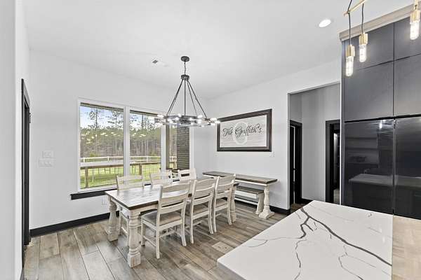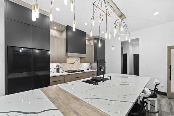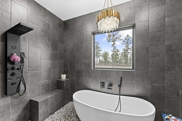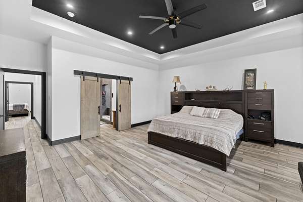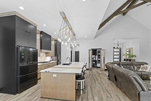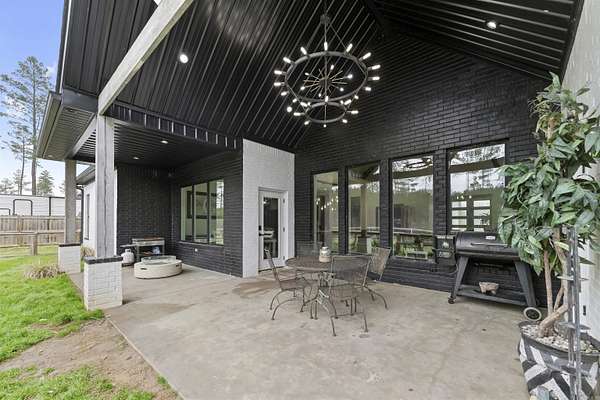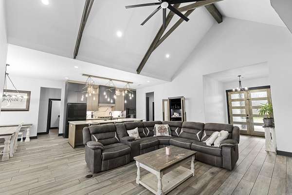 This 4-bedroom, 2.5-bath home with a dedicated office blends rustic design with modern comfort, all set on 2 beautiful acres. Every detail thoughtfully crafted, creating a home that feels both elevated and inviting. The kitchen is a true standout, featuring quartz countertops with a seamless backsplash, soft-close contemporary cabinetry, a gas stove, and stunning walk-in pantry hidden behind stained French doors. Throughout the home, you’ll find wood-look tile flooring and a breathtaking vaulted ceiling with custom beams that brings warmth and rustic charm to the main living space. The electric fireplace with built-ins & stained shelving creates a cozy focal point. The spacious primary suite offers a luxurious retreat with a spa-like bathroom featuring a wet room design with a freestanding tub and walk-in shower combo. Closet offers built ins & vanity space. Step outside to enjoy a vaulted covered patio, ideal for relaxing or entertaining, all overlooking your private acreage with fencing already in place. An additional storage room provides the perfect setup for hunters, hobbyists, or extra gear. This home is truly custom at every turn, offering space, style, and functionality.