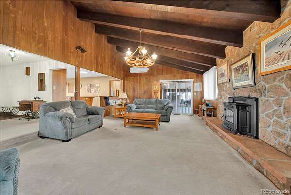 The home is designed for year-round comfort with radiant ceiling heat and a Harman pellet stove providing efficient winter warmth, while mature shade trees and a Mitsubishi split-unit air conditioner keep the home cool during the summer months. Inside you’ll find generously sized bedrooms, including a primary suite with its own full bath, along with a dedicated office. The living room offers abundant natural light, while the sunken great room features vaulted ceilings and a pellet stove, creating a warm and inviting gathering space.