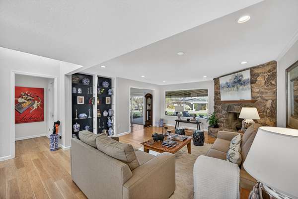 The first impression is the landscape. More than 200 established rose plants surround the home, creating color and fragrance through much of the year. Mature landscaping frames the residence and softens the transition between indoor living and wide-open land. During the rainy season the surrounding hills turn a deep green, then shift to warm gold through summer. Seasonal wildflowers appear throughout the year, and nearby almond orchards contribute to the quiet agricultural atmosphere that defines Capay Valley living.