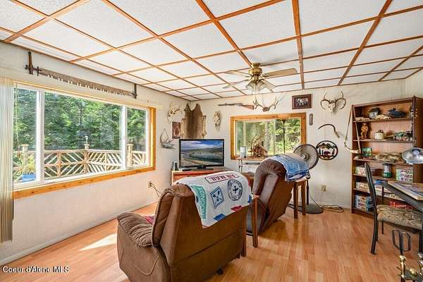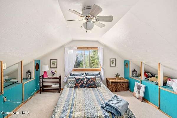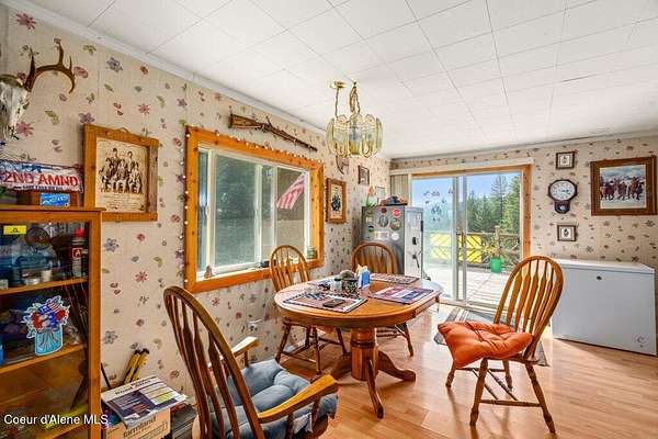 Tucked away at the end of the road, this charming 3-bedroom, 1-bath home offers privacy, rustic character, and serenity on 10 beautiful, wooded acres. Enjoy peaceful mornings and panoramic views from the spacious back deck, complete with unique slatted wood railing detail. Inside, the cozy living room features a large picture window framing the forested views-perfect to enjoy from your favorite chair cozied up to the stove. The enclosed front porch/sunroom adds bonus space for year-round enjoyment. Upstairs, you'll find two charming bedrooms with angled ceilings, great natural light, and thoughtful built-in storage. The property also includes four versatile outbuildings for storage, workshop use, or toys. With plenty of parking space for trailers and RVs, and surrounded by towering trees and wildlife, this property makes an ideal getaway, year-round home, or basecamp for North Idaho adventures.
