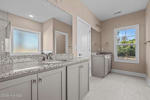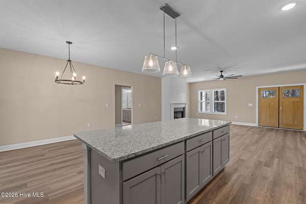 - Ceiling Fan(s), Gas Log, High Ceilings, Kitchen Island, Master Downstairs, Pantry, Tray Ceiling(s), Walk-In Closet(s), Walk-In Shower