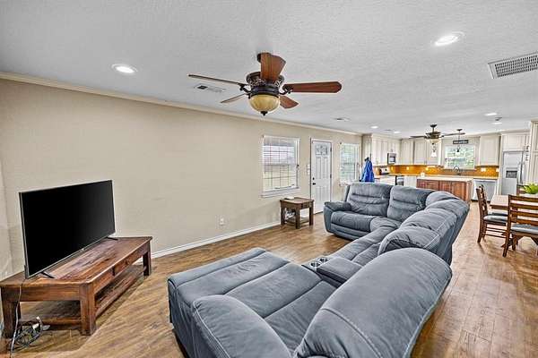 The home features a spacious open-concept living, dining, and kitchen area—ideal for entertaining or everyday comfort. The oversized primary suite, recently added, provides a private retreat with generous space. Past the primary suite, you will find a large laundry area with an added fourth bedroom-flex space-office, all of which are also newly-remodeled. A new metal roof adds durability and long-term value.