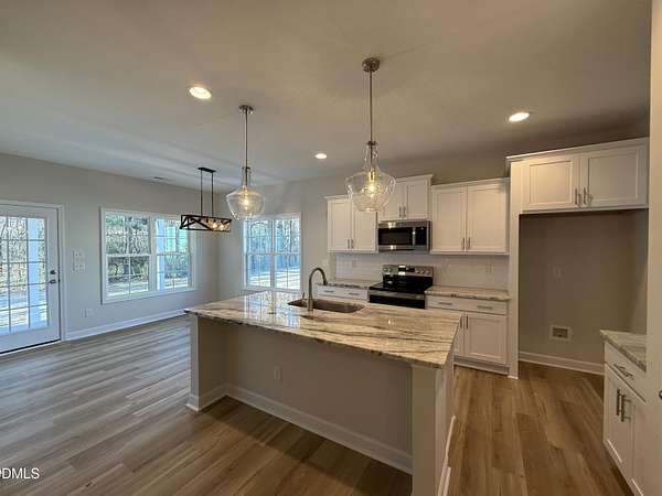 Over 3 acres! The Smith Floor Plan is a stunning 1.5-story with 3 bedrooms, 2 baths, plus a BONUS ROOM and built by JSJ Builders in the newly established Lucas Park Subdivision. Located in the desirable Brogden Community, Princeton School District, and minutes drive from I-95 and the future I-42 (Highway 70), Lucas Park offers unparallelled accessibility from Raleigh to the Coast, and seamless travel north and south! The master-planned community Eastfield Crossing is a short drive away offering even more amenities and conveniences. The main level of the home features, an open living/kitchen combo with granite countertops, breakfast nook, large living room with gas fireplace, and a spacious first-floor owner's suite with a beautiful accent wall and ensuite bathroom. Laundry room entry from the garage. Two additional bedrooms and full bath complete the main floor! Upstairs, you'll find a finished bonus room with ample space and comfort. Call us to secure your 'home-sweet-home' in Lucas Park, where rural charm and urban amenity perfectly blend!