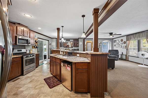 - Breakfast Bar, Kitchen Family Room Combo, Kitchen Island, Living Dining Room, Walk In Pantry