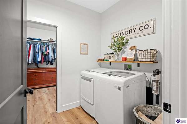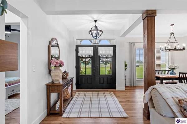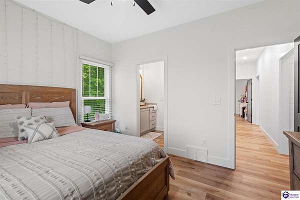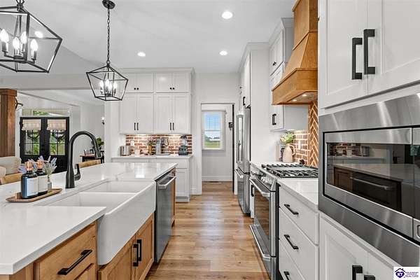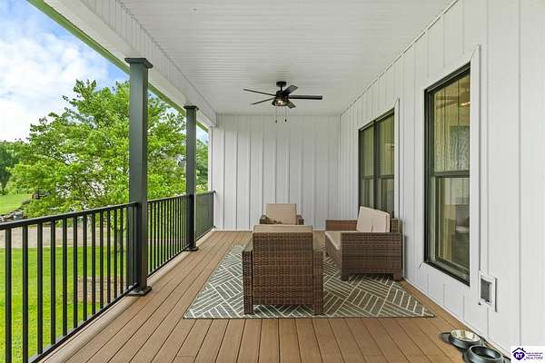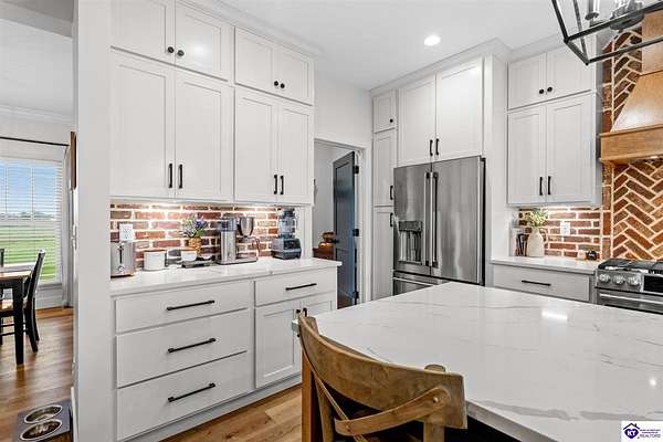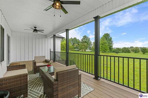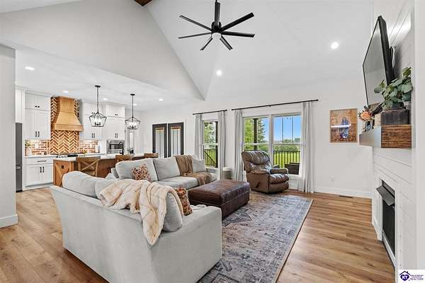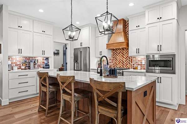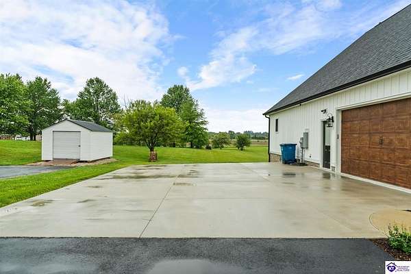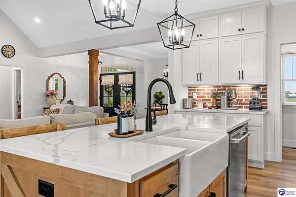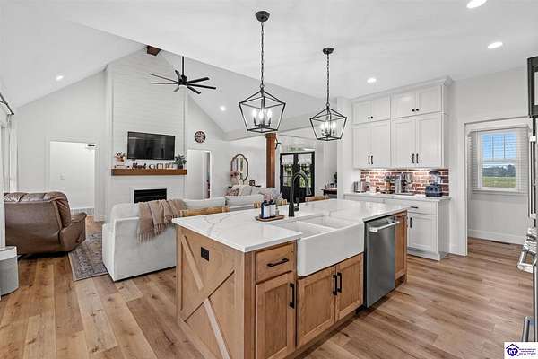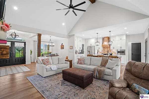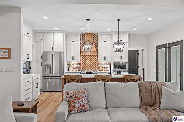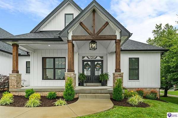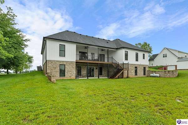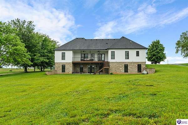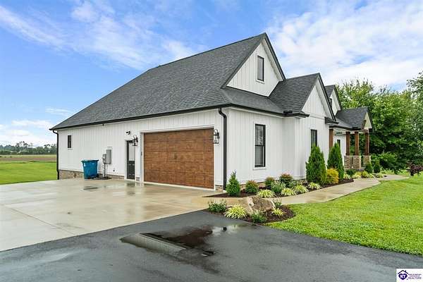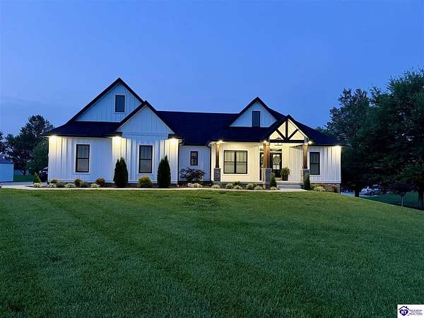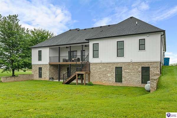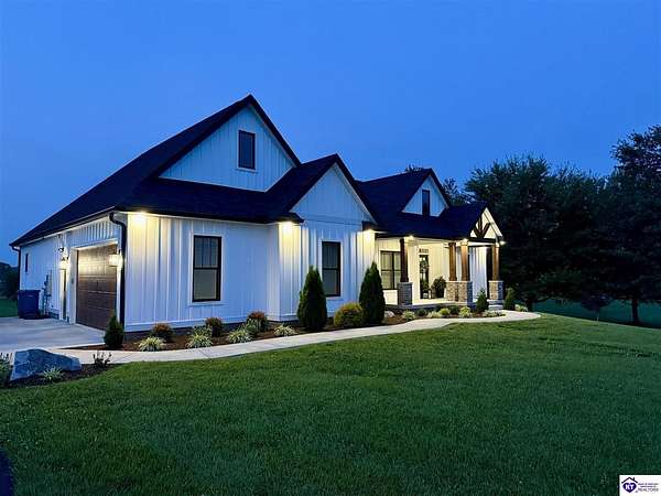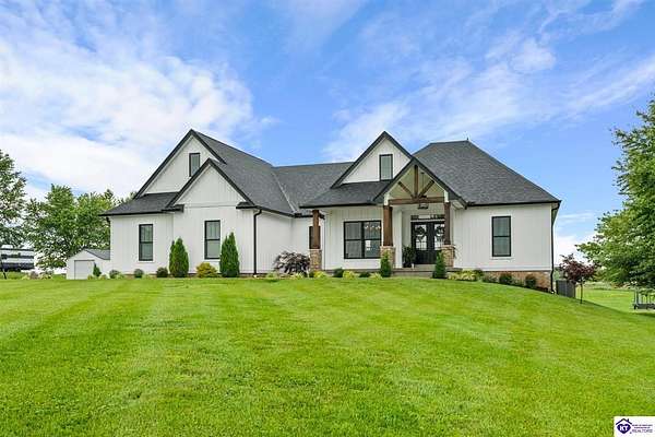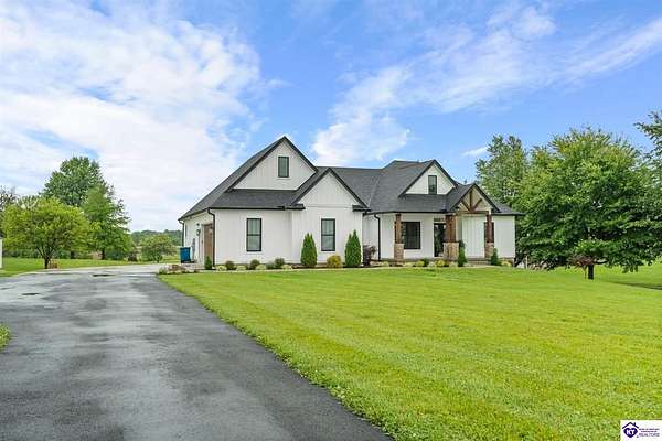 ONLY FIVE MILES TO ELIZABETHTOWN AND 10 MINUTE DRIVE TO I-65! Step into your DREAM HOME and be captivated by its tall ceilings, shiplap gas fireplace, and exquisite kitchen, all meticulously designed in this custom crafted floor plan. This beautiful home features LVP flooring and 9 ft ceilings throughout the entire home creating a spacious ambiance. The main level boasts three bedrooms and two and a half bathrooms, while the partially finished full walkout basement offers an additional two bedrooms, a full bathroom, and an oversized room that can be transformed into a gym, game room, or any other space that suits your preferences. Throughout the entire home, meticulous attention to detail is evident. The GORGEOUS kitchen is equipped with an eight-foot island featuring a farmhouse double basin sink and beautiful Quartz countertops. Custom cabinetry and range hood, thin brick backsplash, ample countertop space, and a walk-in pantry ensure a functional and inviting kitchen. The Café Stainless Steel Wi-Fi-capable appliance package includes a gas stove, standard-sized French door refrigerator, Convection oven Microwave and dishwasher. The primary suite offers a spacious bedroom with a tray ceiling adorned with crown molding, creating an even more inviting atmosphere. The primary bath features a five-foot tiled shower, a private toilet room, and a double vanity with ample linen storage. The primary closet provides ample space and convenient access to the laundry room. On the opposite side of the house, two more bedrooms share a Jack and Jill bathroom. Quartz and Granite throughout. The oversized 28’ x 10’2” back covered porch creates the perfect space for entertaining, relaxing after a long day, or simply enjoying beautiful unobstructed sunrises, made durable and low maintenance thanks to the TimberTech Composite decking and aluminum railing. Also have peace of mind with installed gutter guards, ensuring efficient water flow and reduced maintenance. Energy-efficient with spray foam insulation. This home is situated on 1.57 acres, providing a serene and tranquil retreat away from the hustle and bustle of city life but still conveniently located within a short distance of Elizabethtown and I-65, with easy access to Lincoln Parkway. This location is unparalleled and offers the best of both worlds. Do not miss your opportunity to own this STUNNING home! AGENT OWNED.