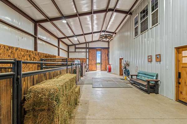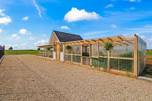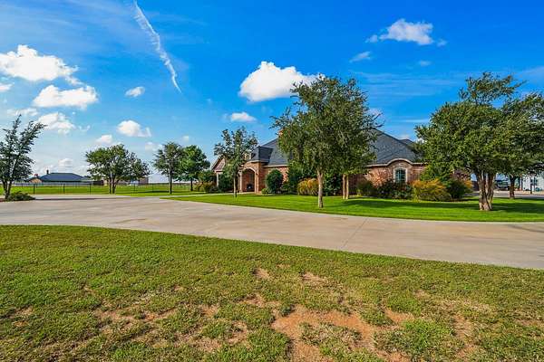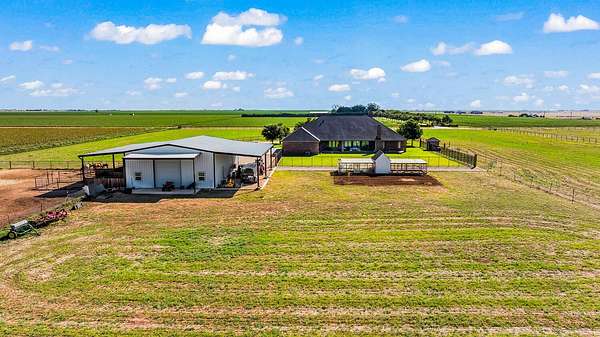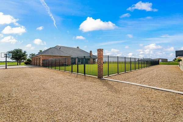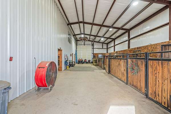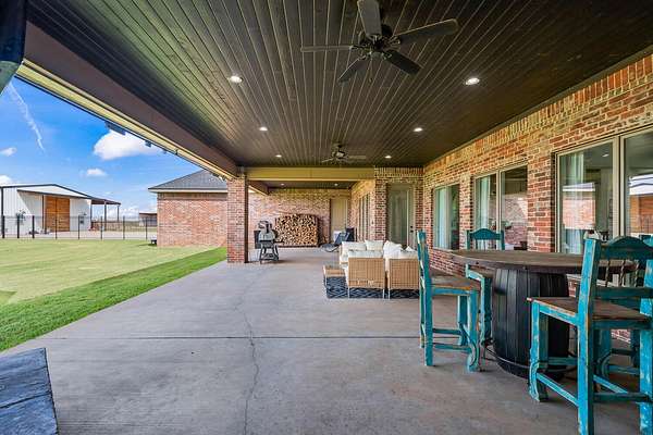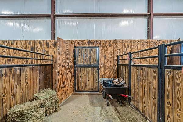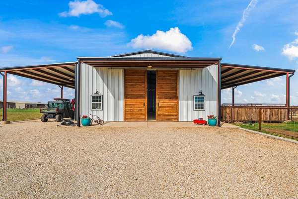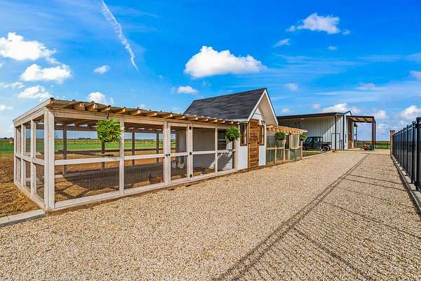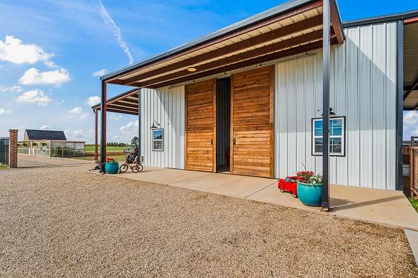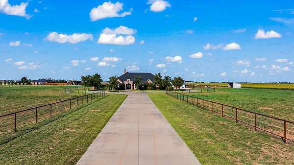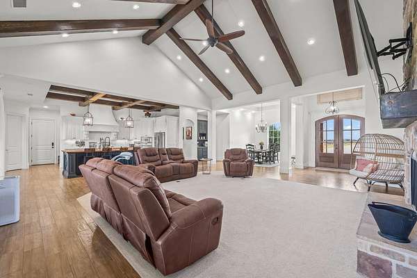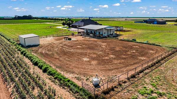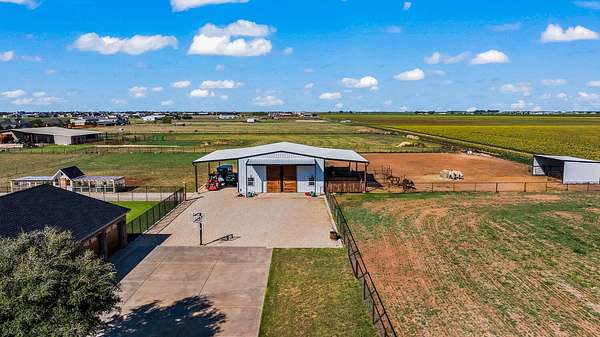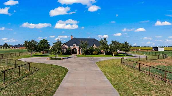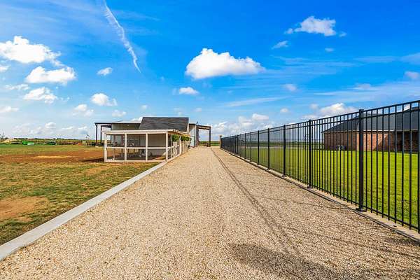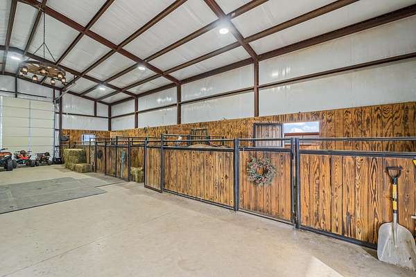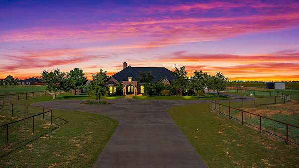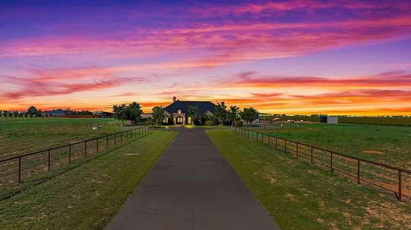 Welcome to Tierra del Prado, a showpiece estate where craftsmanship and acreage come together beautifully. From the moment you arrive, a long, elegant driveway bordered by pasture leads to a circle drive framed by beautiful greenery, mature trees, and a grand double-door entry that offers an unforgettable first impression. Inside, vaulted ceilings with exposed beams frame a stunning stone fireplace, while the chef's kitchen - anchored by a statement range hood - flows seamlessly into the open-concept living and dining areas. Picture windows capture sweeping sunset views across the lawn and open acreage, and a covered back porch with its own fireplace extends the living space outdoors. The owner's suite is a retreat of its own, featuring a barn-door entry to a spa-like bath with dual vanities, a soaking tub crowned by a chandelier, and an oversized shower with custom tile niches. The beautifully appointed walk-in closet with built-ins completes the space. A dedicated office with its own library provides a picturesque workspace, while the additional two bedrooms are tucked separately and connected by a Jack-and-Jill bath for privacy and convenience. The finished basement and walk-up attic offer impressive versatility and storage, complemented by a 4-car garage. For equestrian living, the barn is a true standout. Measuring 80x60 with an 8-inch-thick foundation, it features multiple horse stalls, each with its own drain, cut gates for flexibility, and the ability to expand to 30x10 foaling or weaning stalls. Every stall has its own night light and plug for fans or water tank heaters, creating a thoughtful and practical setup for horses' comfort. The barn runs on its own electric meter and includes a 2 HP well with a 2-inch irrigation pipe. It's paired with a 1000-gallon septic system with RV dump, plus 250-amp and 130-amp RV hookups and a 100-amp welding plug. The barn's generous lien space can accommodate RVs or motorhomes up to 16 feet tall. Additional features include a 14x30 tool room, a spacious 14x60 guest quarters/efficiency apartment with kitchen and bath above the barn, and a custom chicken coop with indoor/outdoor access and attached garden. The acreage itself is fully fenced with 2 7/8-inch pipe fencing, three 16-foot gates, and one 20-foot gate to the pasture. Set on 8 fully fenced acres in one of the area's most established neighborhoods, this estate is a rare find, an exceptional blend of elegance, equestrian function, and private country living with easy access to nearby amenities.