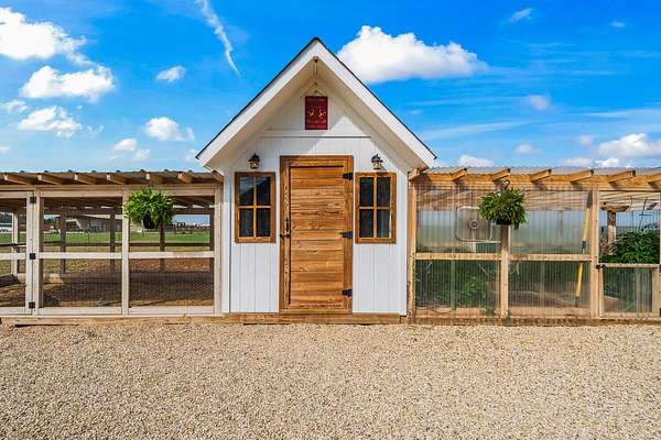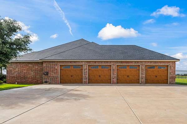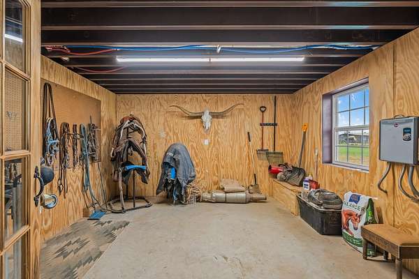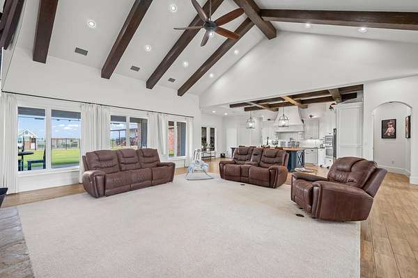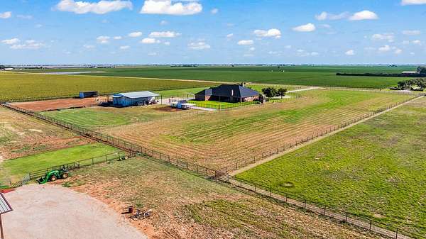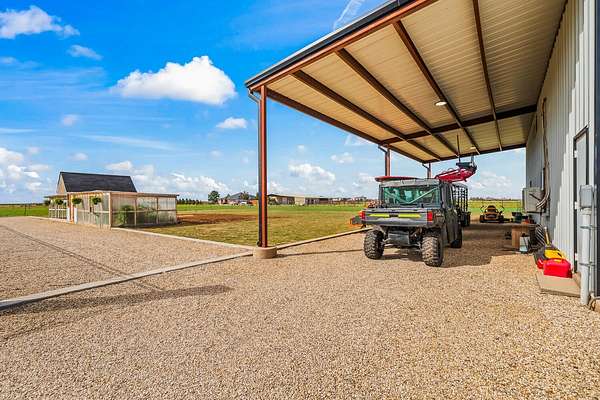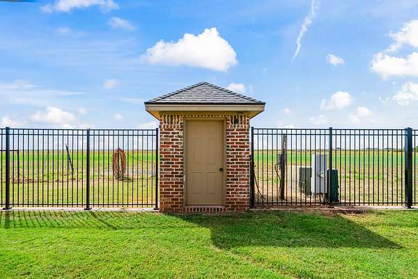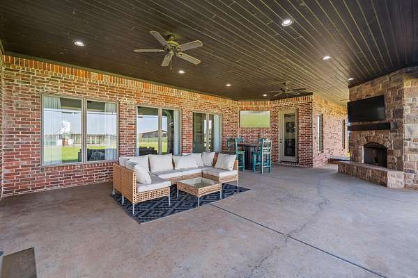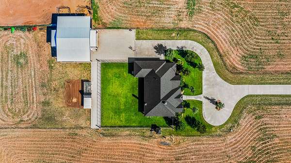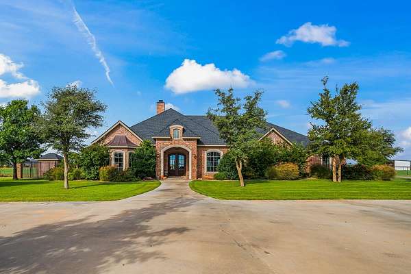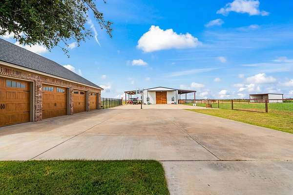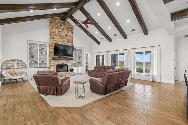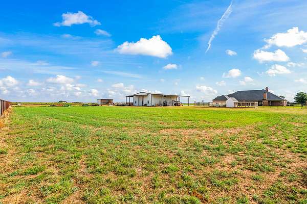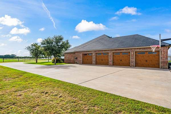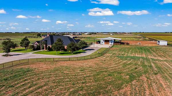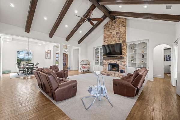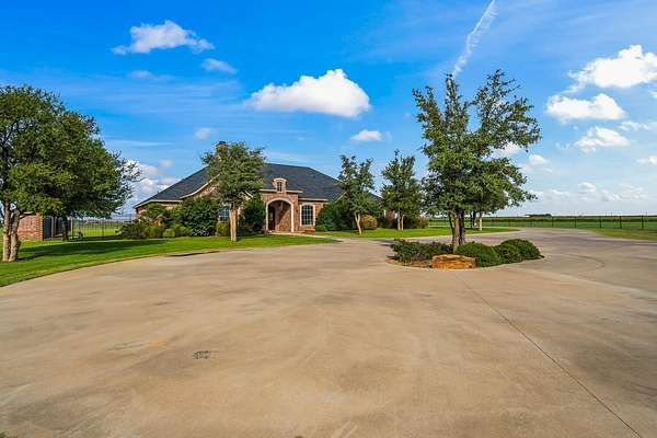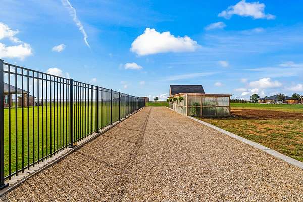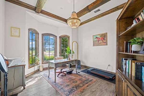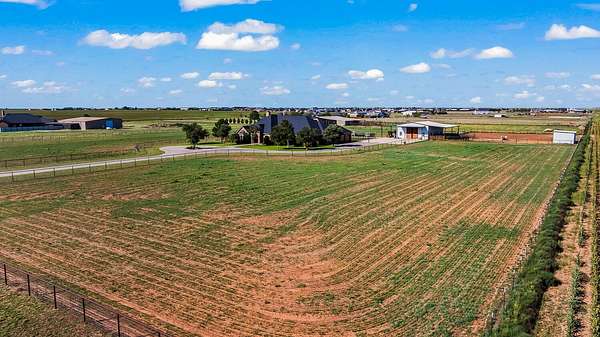 Welcome to Tierra del Prado, a showpiece estate where craftsmanship and acreage come together beautifully. From the moment you arrive, a long, elegant driveway bordered by pasture leads to a circle drive framed by beautiful greenery, mature trees, and a grand double-door entry that offers an unforgettable first impression. Inside, vaulted ceilings with exposed beams frame a stunning stone fireplace, while the chef's kitchen - anchored by a statement range hood - flows seamlessly into the open-concept living and dining areas. Picture windows capture sweeping sunset views across the lawn and open acreage, and a covered back porch with its own fireplace extends the living space outdoors. The owner's suite is a retreat of its own, featuring a barn-door entry to a spa-like bath with dual vanities, a soaking tub crowned by a chandelier, and an oversized shower with custom tile niches. The beautifully appointed walk-in closet with built-ins completes the space. A dedicated office with its own library provides a picturesque workspace, while the additional two bedrooms are tucked separately and connected by a Jack-and-Jill bath for privacy and convenience. The finished basement and walk-up attic offer impressive versatility and storage, complemented by a 4-car garage. For equestrian living, the barn is a true standout. Measuring 80x60 with an 8-inch-thick foundation, it features multiple horse stalls, each with its own drain, cut gates for flexibility, and the ability to expand to 30x10 foaling or weaning stalls. Every stall has its own night light and plug for fans or water tank heaters, creating a thoughtful and practical setup for horses' comfort. The barn runs on its own electric meter and includes a 2 HP well with a 2-inch irrigation pipe. It's paired with a 1000-gallon septic system with RV dump, plus 250-amp and 130-amp RV hookups and a 100-amp welding plug. The barn's generous lien space can accommodate RVs or motorhomes up to 16 feet tall. Additional features include a 14x30 tool room, a spacious 14x60 guest quarters/efficiency apartment with kitchen and bath above the barn, and a custom chicken coop with indoor/outdoor access and attached garden. The acreage itself is fully fenced with 2 7/8-inch pipe fencing, three 16-foot gates, and one 20-foot gate to the pasture. Set on 8 fully fenced acres in one of the area's most established neighborhoods, this estate is a rare find, an exceptional blend of elegance, equestrian function, and private country living with easy access to nearby amenities.