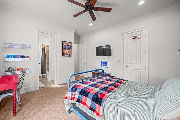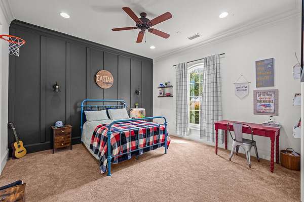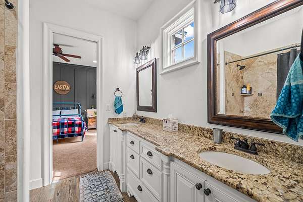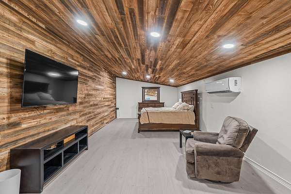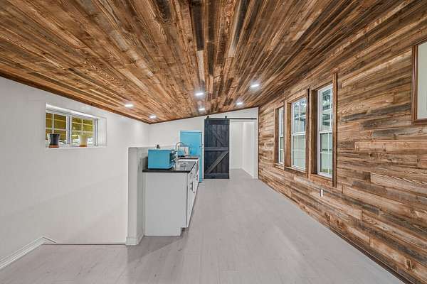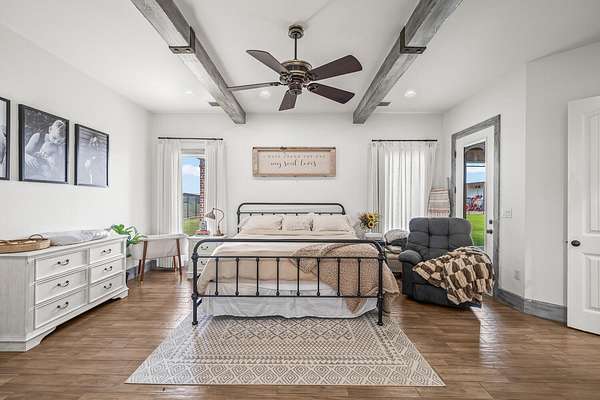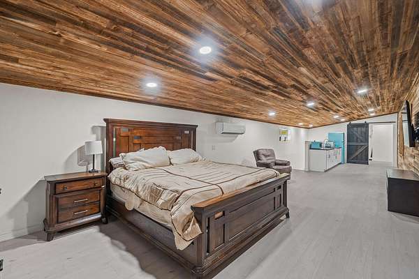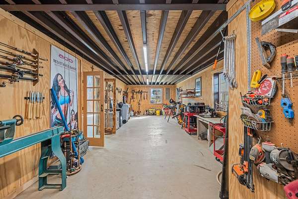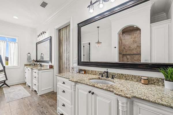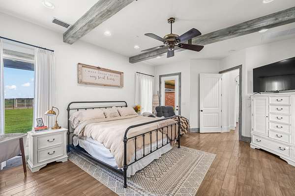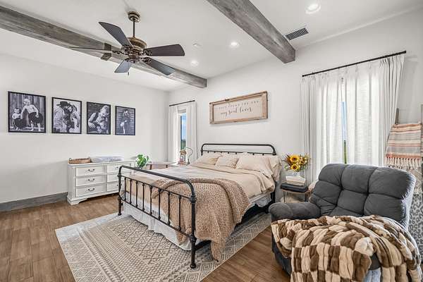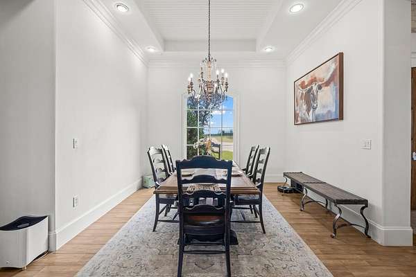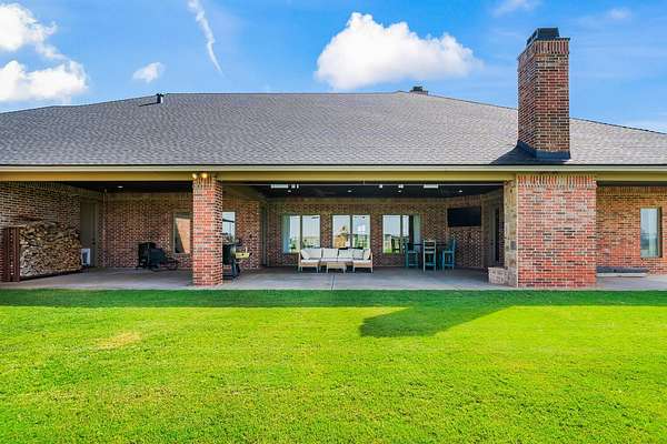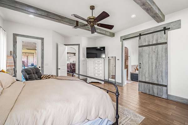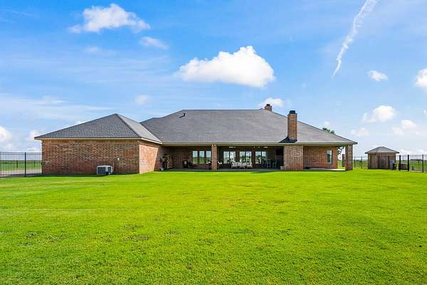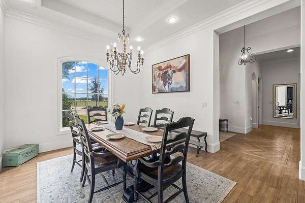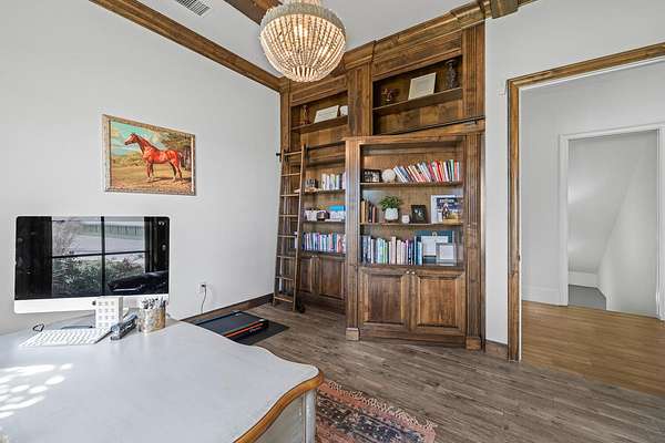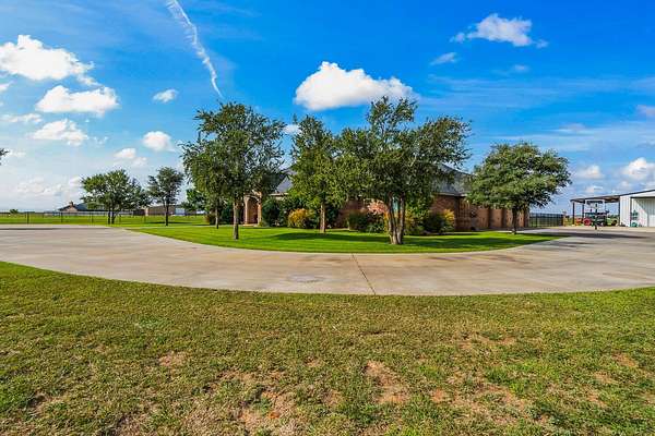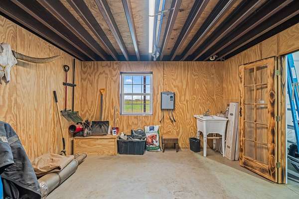 Welcome to Tierra del Prado, a showpiece estate where craftsmanship and acreage come together beautifully. From the moment you arrive, a long, elegant driveway bordered by pasture leads to a circle drive framed by beautiful greenery, mature trees, and a grand double-door entry that offers an unforgettable first impression. Inside, vaulted ceilings with exposed beams frame a stunning stone fireplace, while the chef's kitchen - anchored by a statement range hood - flows seamlessly into the open-concept living and dining areas. Picture windows capture sweeping sunset views across the lawn and open acreage, and a covered back porch with its own fireplace extends the living space outdoors. The owner's suite is a retreat of its own, featuring a barn-door entry to a spa-like bath with dual vanities, a soaking tub crowned by a chandelier, and an oversized shower with custom tile niches. The beautifully appointed walk-in closet with built-ins completes the space. A dedicated office with its own library provides a picturesque workspace, while the additional two bedrooms are tucked separately and connected by a Jack-and-Jill bath for privacy and convenience. The finished basement and walk-up attic offer impressive versatility and storage, complemented by a 4-car garage. For equestrian living, the barn is a true standout. Measuring 80x60 with an 8-inch-thick foundation, it features multiple horse stalls, each with its own drain, cut gates for flexibility, and the ability to expand to 30x10 foaling or weaning stalls. Every stall has its own night light and plug for fans or water tank heaters, creating a thoughtful and practical setup for horses' comfort. The barn runs on its own electric meter and includes a 2 HP well with a 2-inch irrigation pipe. It's paired with a 1000-gallon septic system with RV dump, plus 250-amp and 130-amp RV hookups and a 100-amp welding plug. The barn's generous lien space can accommodate RVs or motorhomes up to 16 feet tall. Additional features include a 14x30 tool room, a spacious 14x60 guest quarters/efficiency apartment with kitchen and bath above the barn, and a custom chicken coop with indoor/outdoor access and attached garden. The acreage itself is fully fenced with 2 7/8-inch pipe fencing, three 16-foot gates, and one 20-foot gate to the pasture. Set on 8 fully fenced acres in one of the area's most established neighborhoods, this estate is a rare find, an exceptional blend of elegance, equestrian function, and private country living with easy access to nearby amenities.