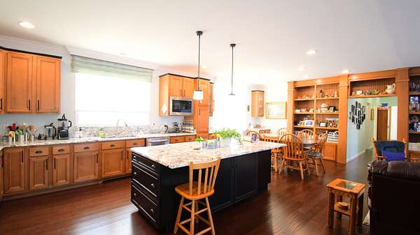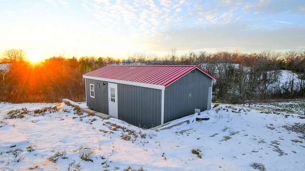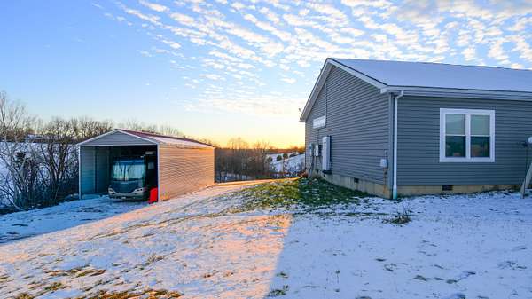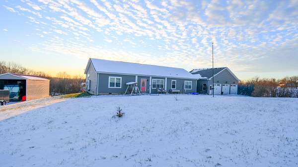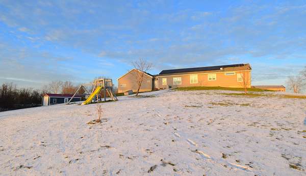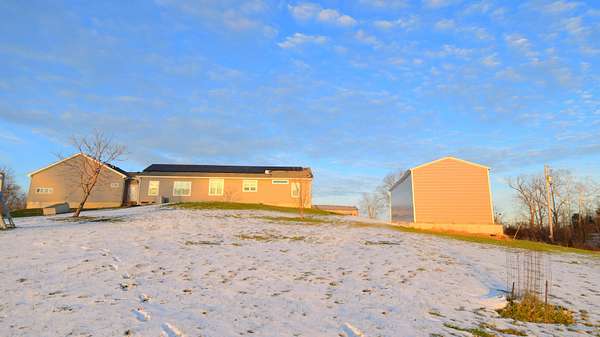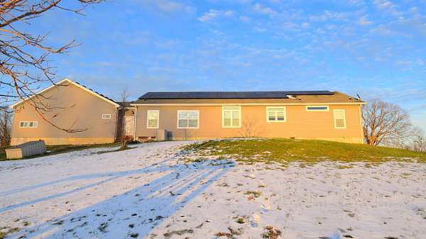 Beautiful ranch home situated on 8 peaceful acres, just 3 miles north of the Bluegrass Parkway, offering quick and convenient access to Lexington or Bardstown. Enjoy stunning views of rolling farmland with abundant wildlife-your own private retreat. The great room (26' x 29.5') is a showstopper, offering built-in shelving, laminate flooring, large windows for exceptional natural light, and a beautiful kitchen with granite countertops, an oversized island with electrical outlets, and a dining area accented by built-in shelving and cabinetry. The primary suite (15' x 16') is truly impressive, featuring a spacious walk-in closet (6' x 9') and an oversized private bath (14.5' x 15.5') complete with a walk-in shower, soaking tub, private toilet room, double vanities, and ample storage. Additional highlights include a large mudroom (10.8' x 10.3') with excellent storage, a breezeway that provides easy backyard access, and a huge attached 3-car garage (36.5' x 30.5'). The two secondary bedrooms are generously sized, with one featuring a 4' x 8' walk-in closet. For storage and versatility, the property includes an RV storage building (18' x 45') with 50-amp service, plus an additional storage building (28' x 15.5') ideal for tractors, lawn equipment, or tools. This 5-Star Energy-rated home features solar panels that cover the cost of utilities, providing efficiency and long-term savings. This exceptional property offers space, efficiency, privacy, and convenience-you don't want to miss this one.