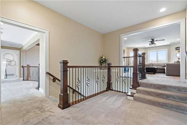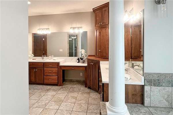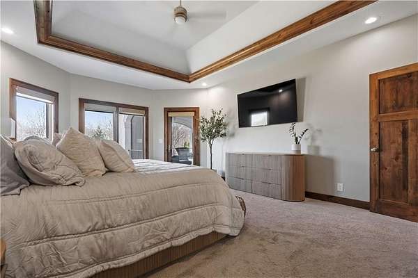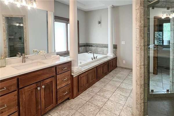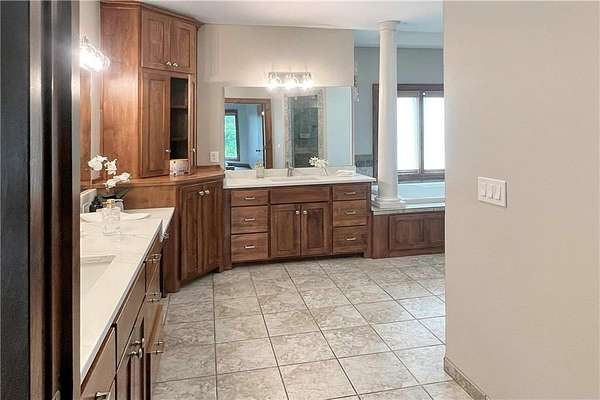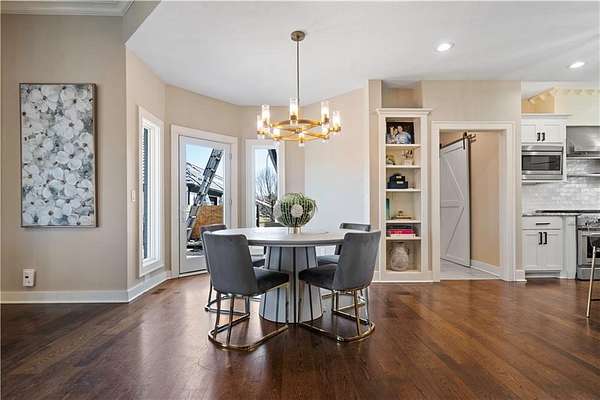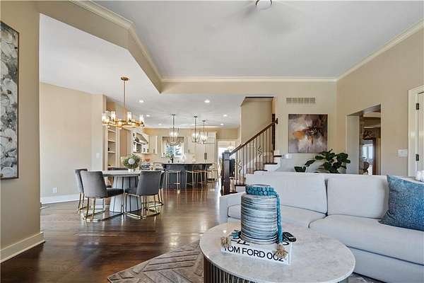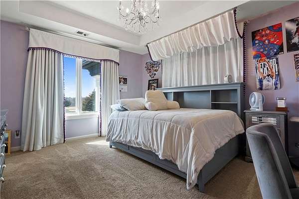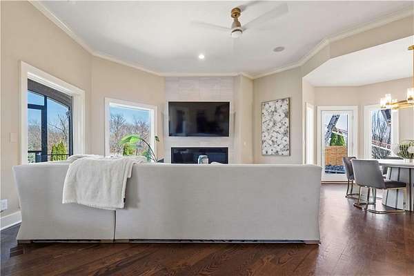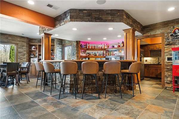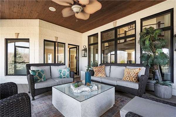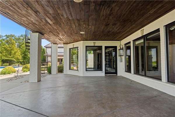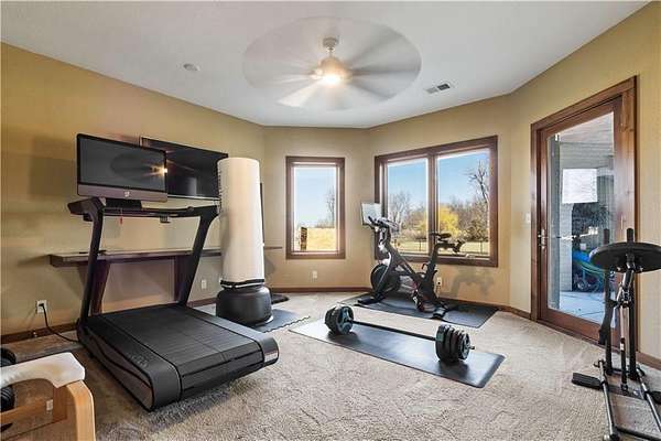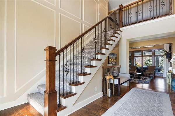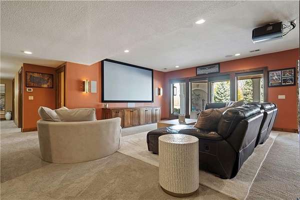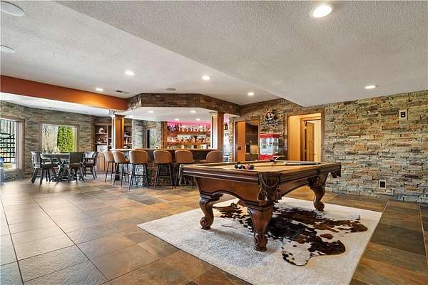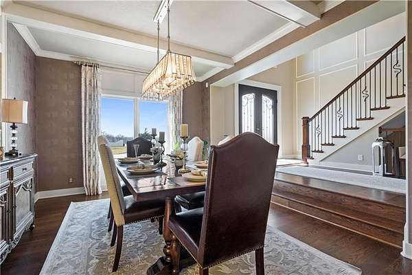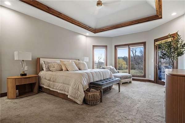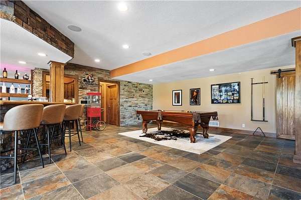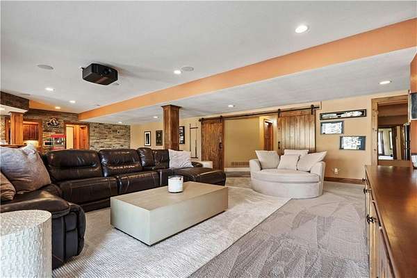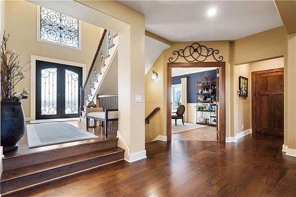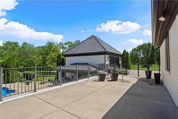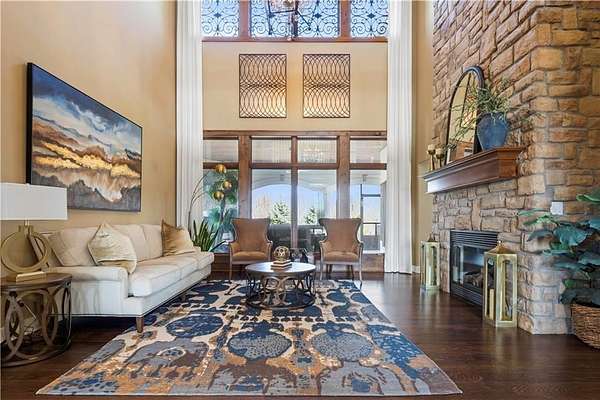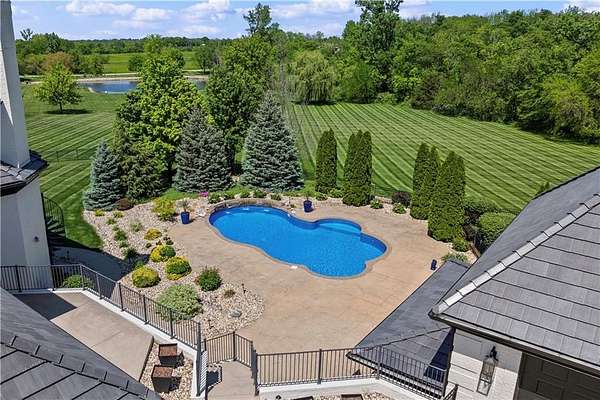 Experience refined country living in this custom estate on nearly 10 acres in coveted southern Johnson County with rare access to the prestigious Blue Valley School District. This elegant 1.5-story home offers just under 7,500 sq ft of beautifully designed living space, blending timeless architecture with modern luxury and thoughtful details throughout. The main level features soaring ceilings, exquisite millwork, and abundant natural light filling the grand foyer. Enjoy a formal dining room, executive office, and vaulted great room anchored by a fireplace. The gourmet kitchen boasts granite countertops, Sub-Zero refrigeration, premium appliances, an expansive island, custom cabinetry, and a walk-in pantry. It opens to a screened lanai, perfect for seamless indoor-outdoor living and entertaining guests. The main-floor primary suite includes a spa-inspired bath, generous walk-in closet, and private lanai access for tranquil mornings or peaceful evenings. Upstairs offers three spacious bedrooms, two baths, a cozy loft living area, and a hidden playroom. The finished walk-out lower level includes two additional bedrooms, 1.5 baths, a luxurious home theater, game and media rooms, custom bar, and bonus room ideal for fitness, crafts, or hobbies. Step outside to your private resort--a heated saltwater pool with waterfall, charming pool house, covered patio, and a fully equipped outdoor kitchen featuring a hibachi grill--perfect for year-round entertaining amid mature landscaping and serene vistas. Recent upgrades include a new 50-year concrete tile roof (2025), HVAC system (2024), fresh paint inside and out, smart home automation, energy-efficient systems, and a rare six-car garage ideal for collectors or multigenerational living. Located just minutes from vibrant Overland Park and easy highway access, this estate offers an unparalleled lifestyle of elegance, privacy, and comfort in a truly spectacular setting