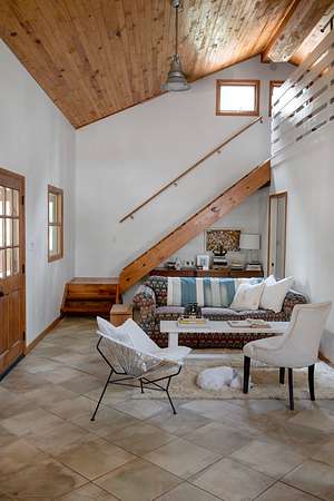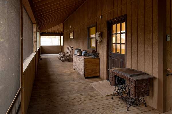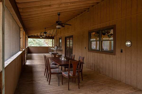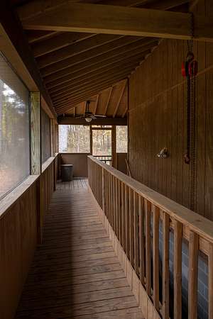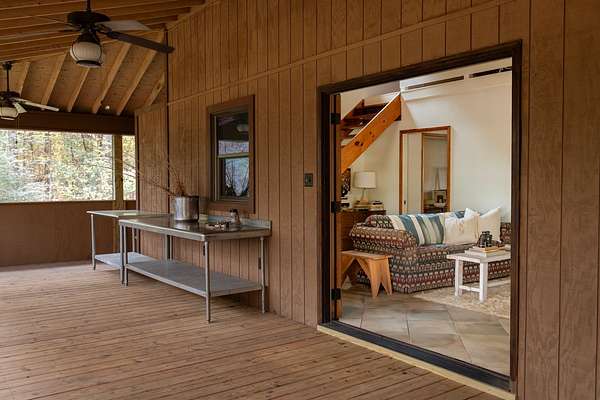 The cabin features an open-concept living space with vaulted pine ceilings, a loft overlooking the living area, and a wraparound screened porch ideal for relaxing or entertaining. The master suite includes a modern tiled bathroom with a luxury rain shower system. A chef-inspired kitchen anchors the home, showcasing a 60-inch Vulcan commercial gas range, farmhouse sink, butcher block countertops, and stainless appliances--perfect for hosting gatherings. An unfinished basement provides flexible space for a workshop or storage.